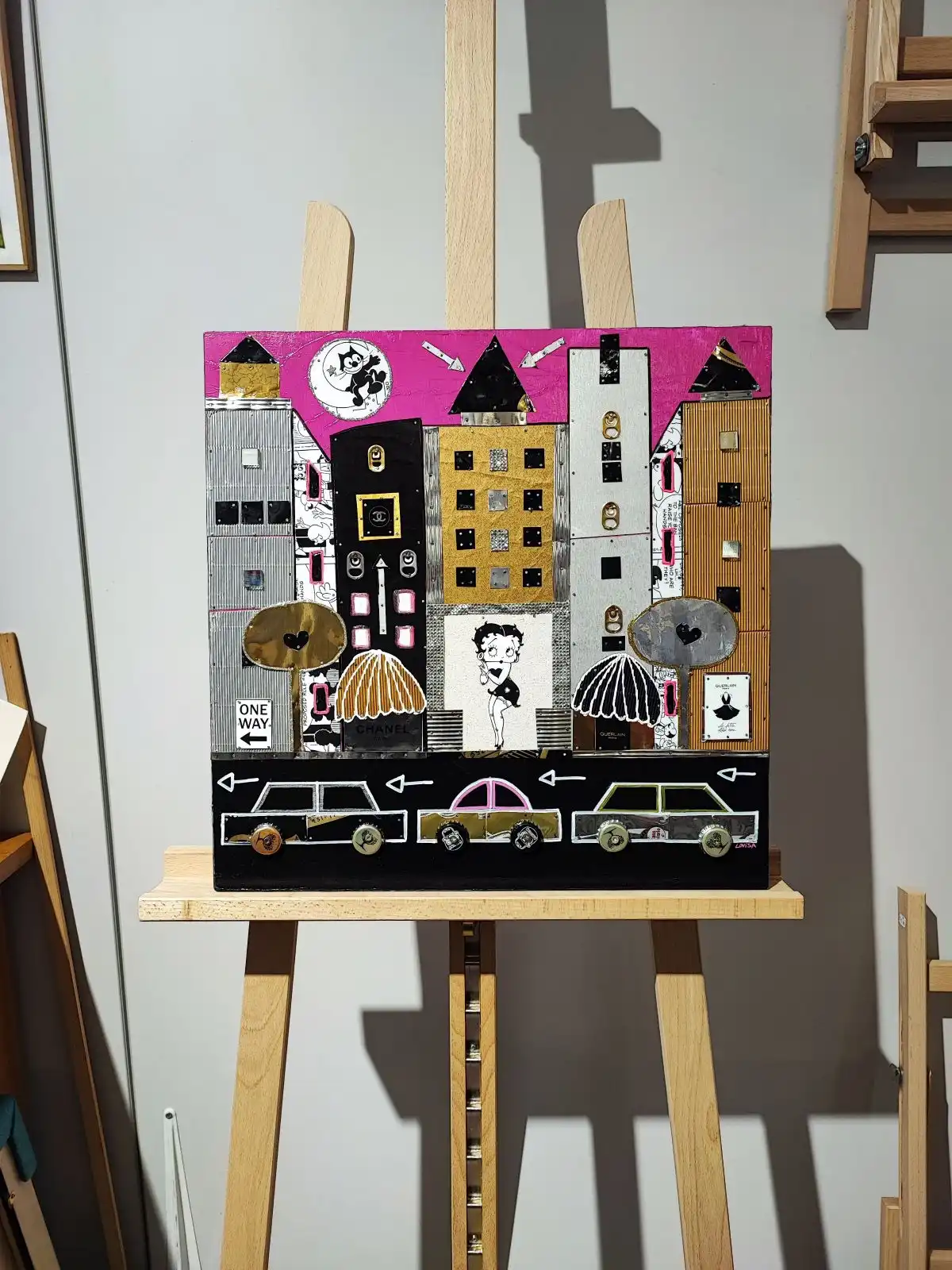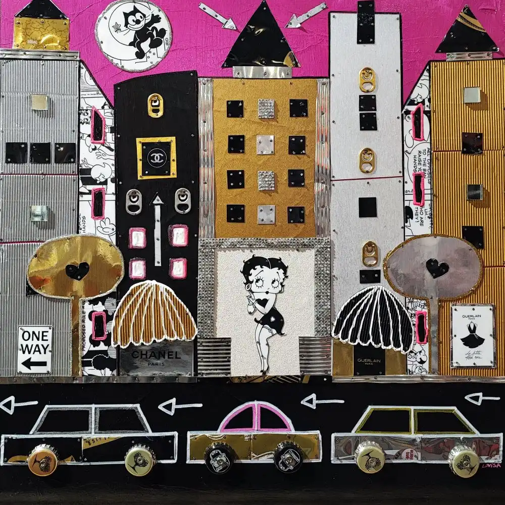 La ville de New York est une des sources d’inspiration favorite de l’artiste. Ses œuvres dynamiques et joyeuses, entre Pop art et art de la récup, mêlent acrylique, collage, recyclage de canettes de soda, boîtes de conserves, capsules de bouteilles clouées sur bois.