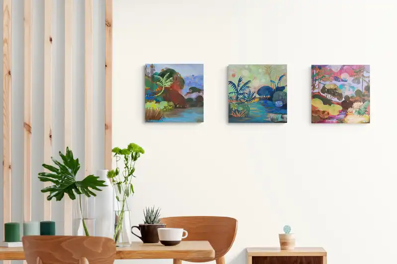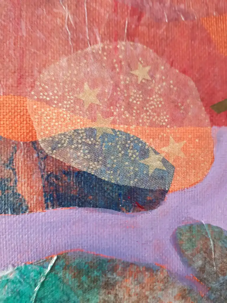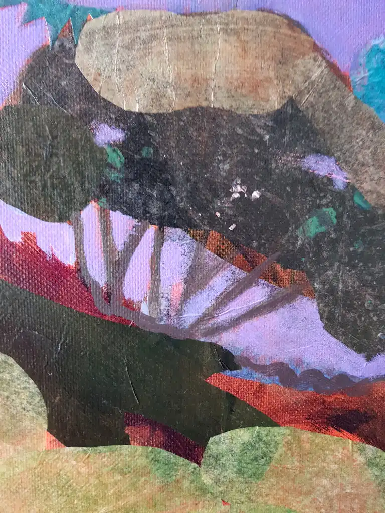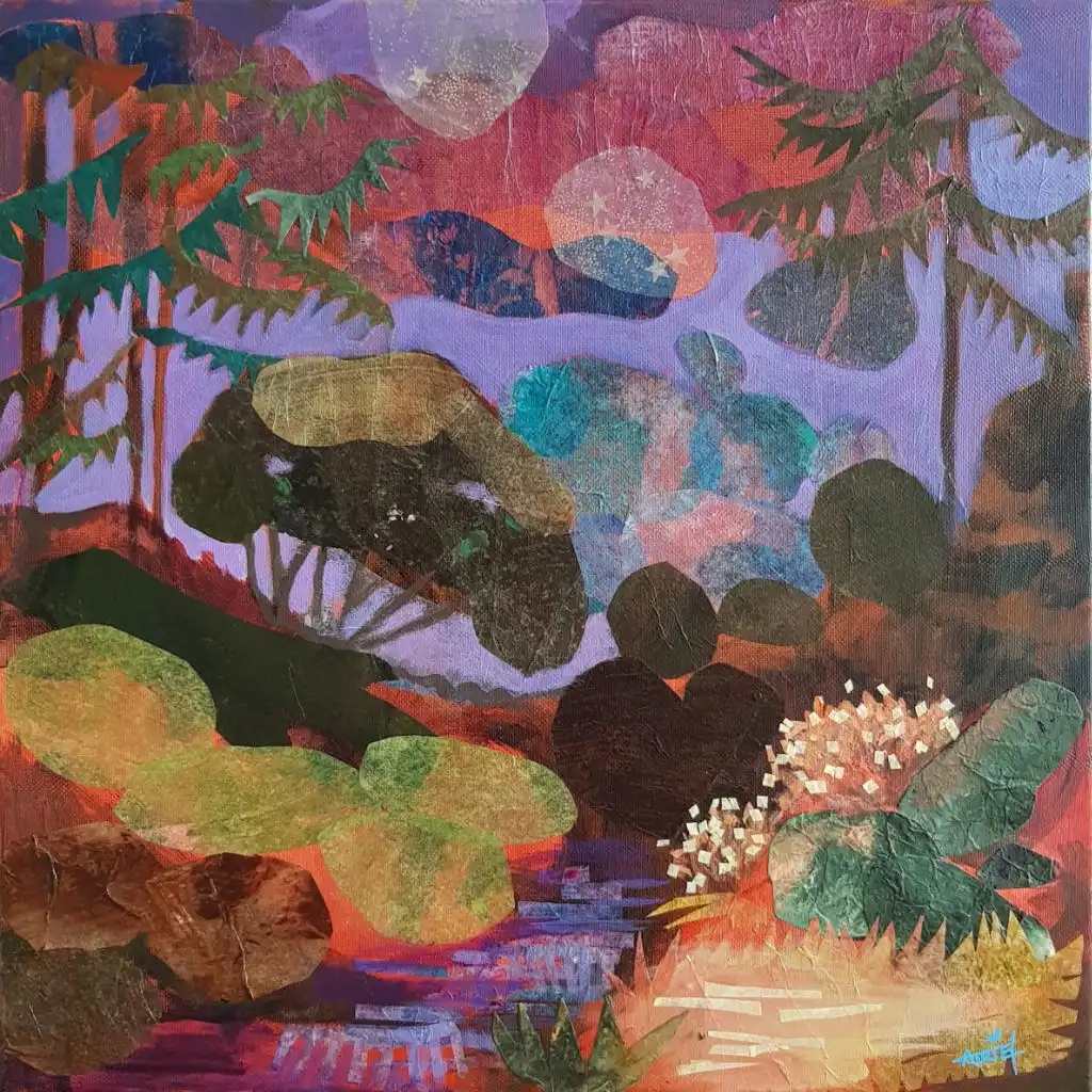 Une oeuvre inspirée par l’univers des gravures monochromes de Gustave Doré. L’artiste réinterprête le paysage en couleurs, en utilisant différentes techniques de collages. Ici, une nuit magique donne des couleurs merveilleuses aux arbres et aux végétaux… Un univers très original.