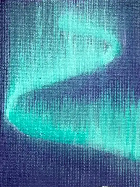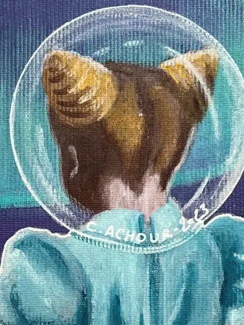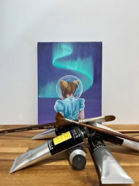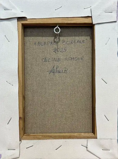 Ce tableau est né de mon envie de représenter une aurore boréale, sans raison particulière à part son côté surnaturel. La petite fille est celle du tableau « Promenons-nous dans les bois ». C’est une