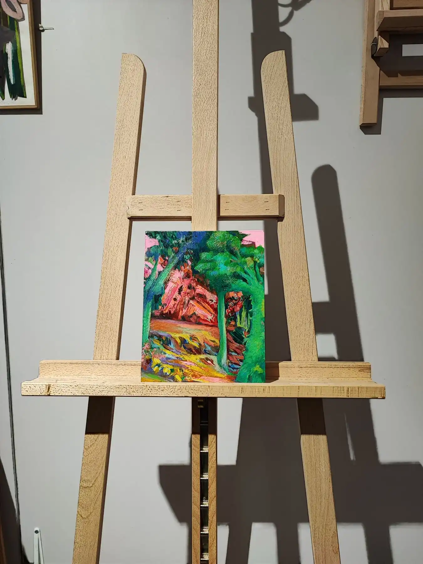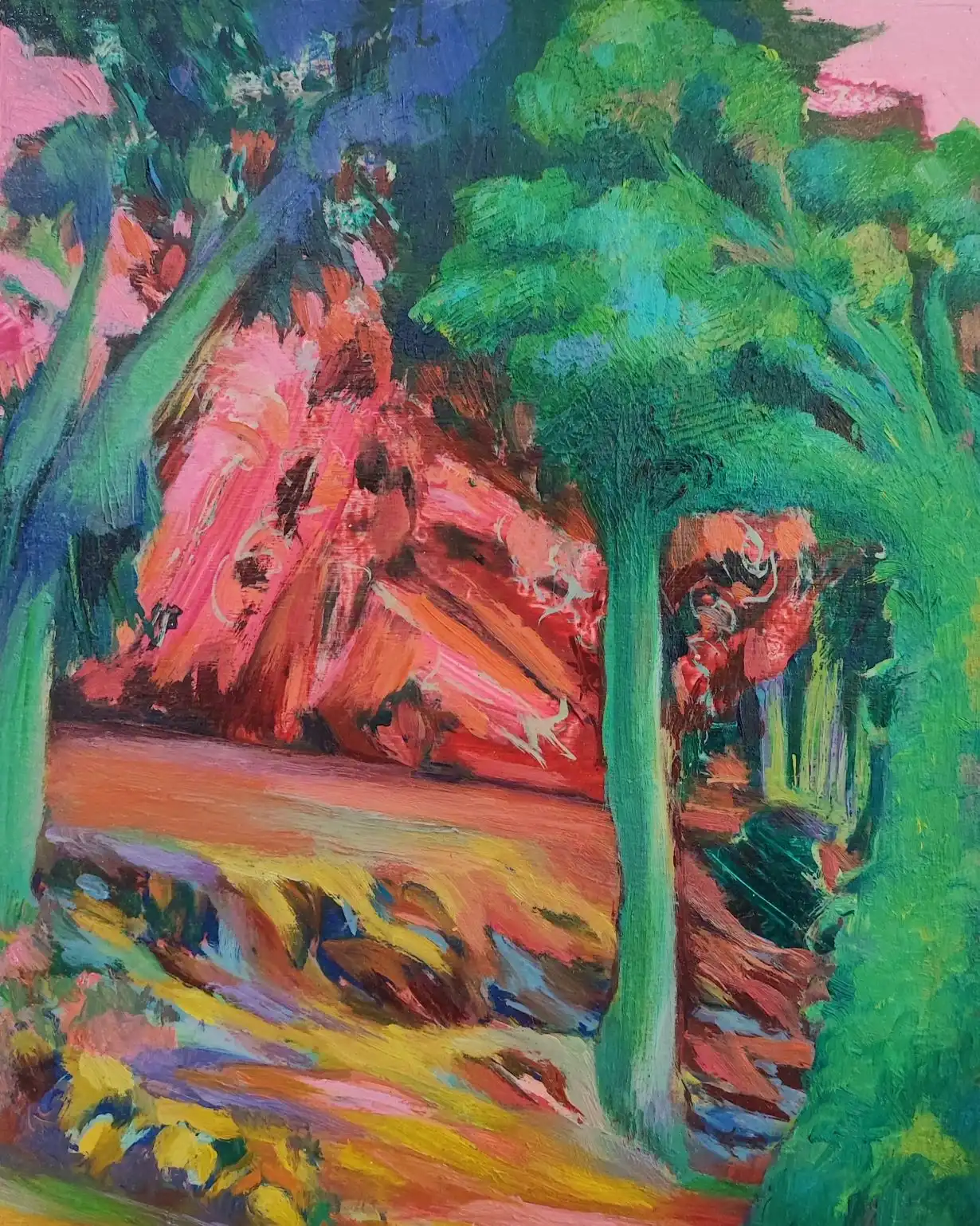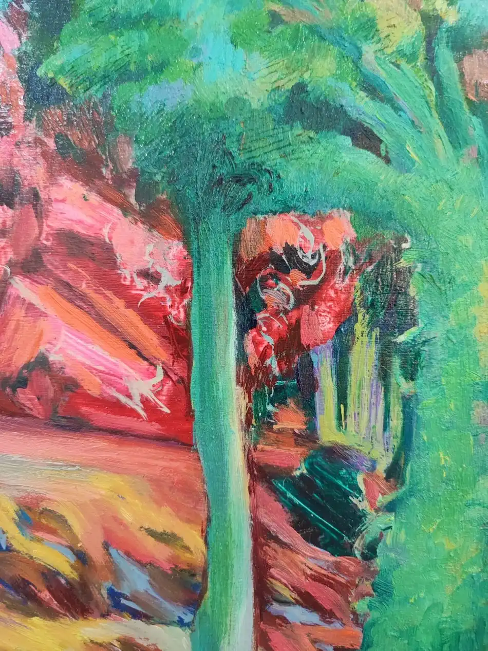Cette œuvre transporte le spectateur dans un univers vibrant et coloré, où la nature prend des airs surréalistes. Les teintes éclatantes de vert, rose et rouge s’entremêlent pour créer un paysage où les arbres semblent danser. Les coups de pinceau audacieux confèrent à la scène une texture dynamique, accentuant l’énergie qui en émane.