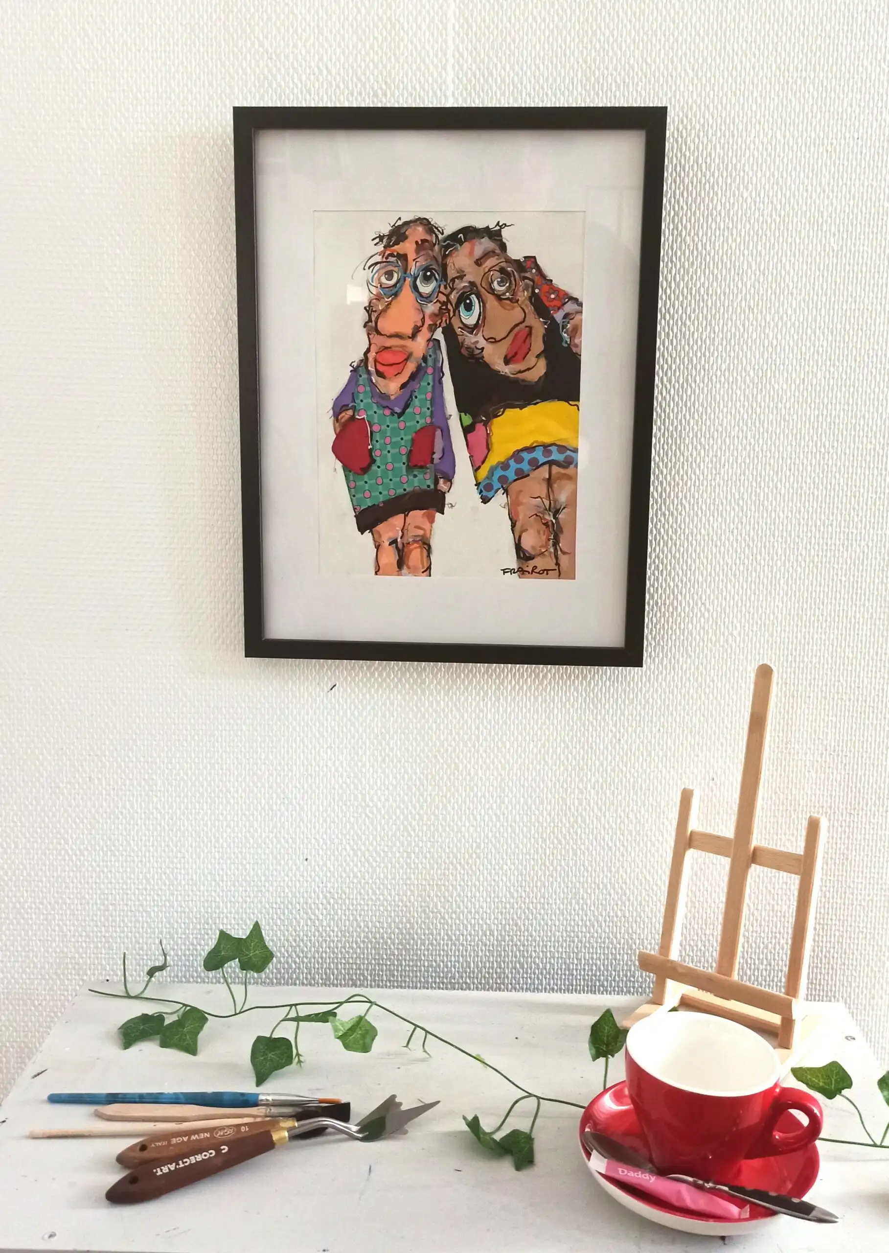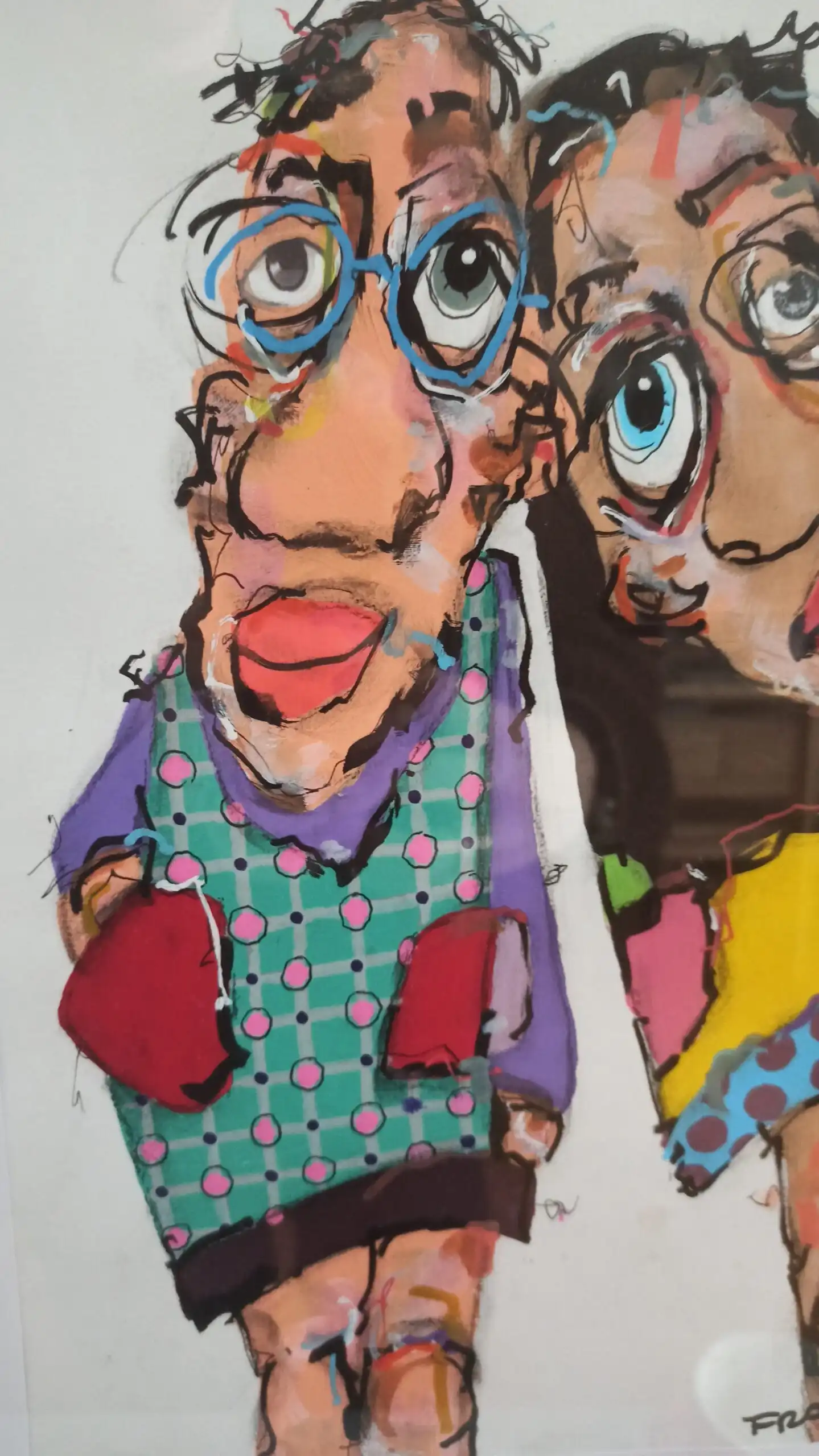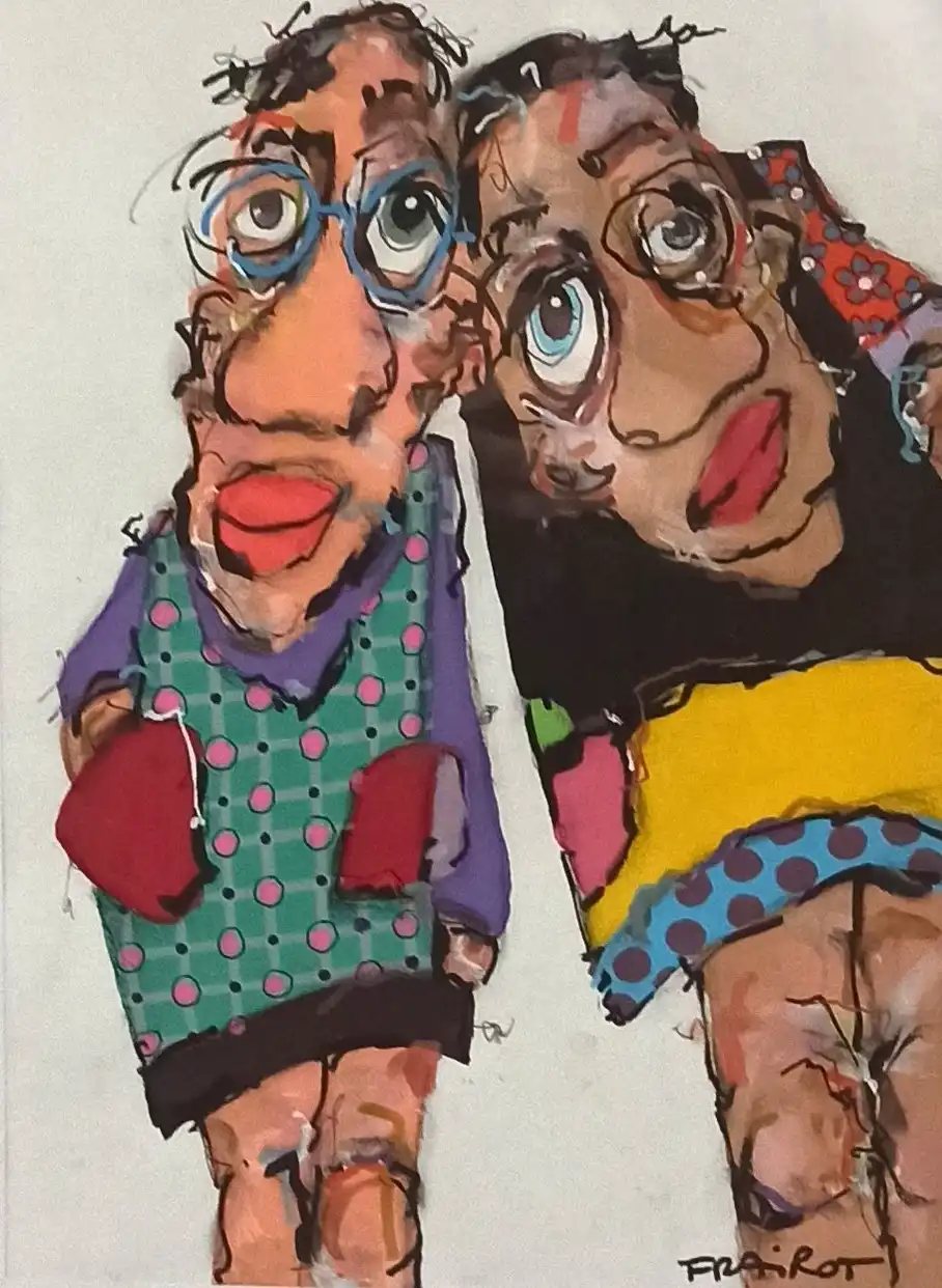 Cette œuvre audacieuse présente deux personnages excentriques aux traits déformés, capturant l’essence du grotesque avec une touche d’humour. Les couleurs vives et contrastées – le turquoise à pois, le jaune flamboyant et le rouge vif – ajoutent une dimension vibrante et dynamique à la composition. Les lignes noires, épaisses et fluides, délimitent vigoureusement les formes, créant un effet à la fois chaotique et maîtrisé. L’artiste joue avec les proportions, donnant aux figures de grands yeux expressifs et des visages démesurés, renforçant une sensation d’empathie et d’étrangeté.