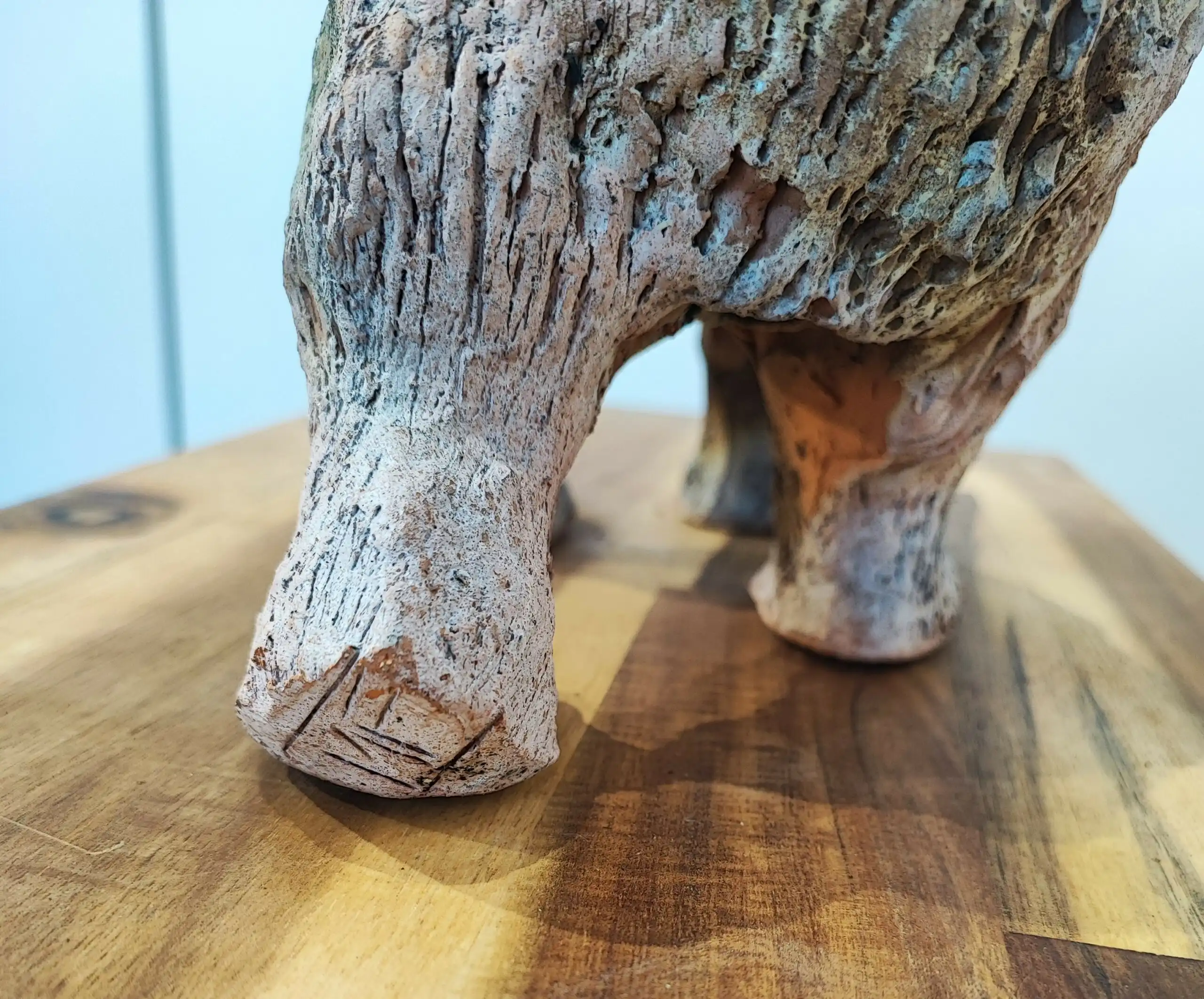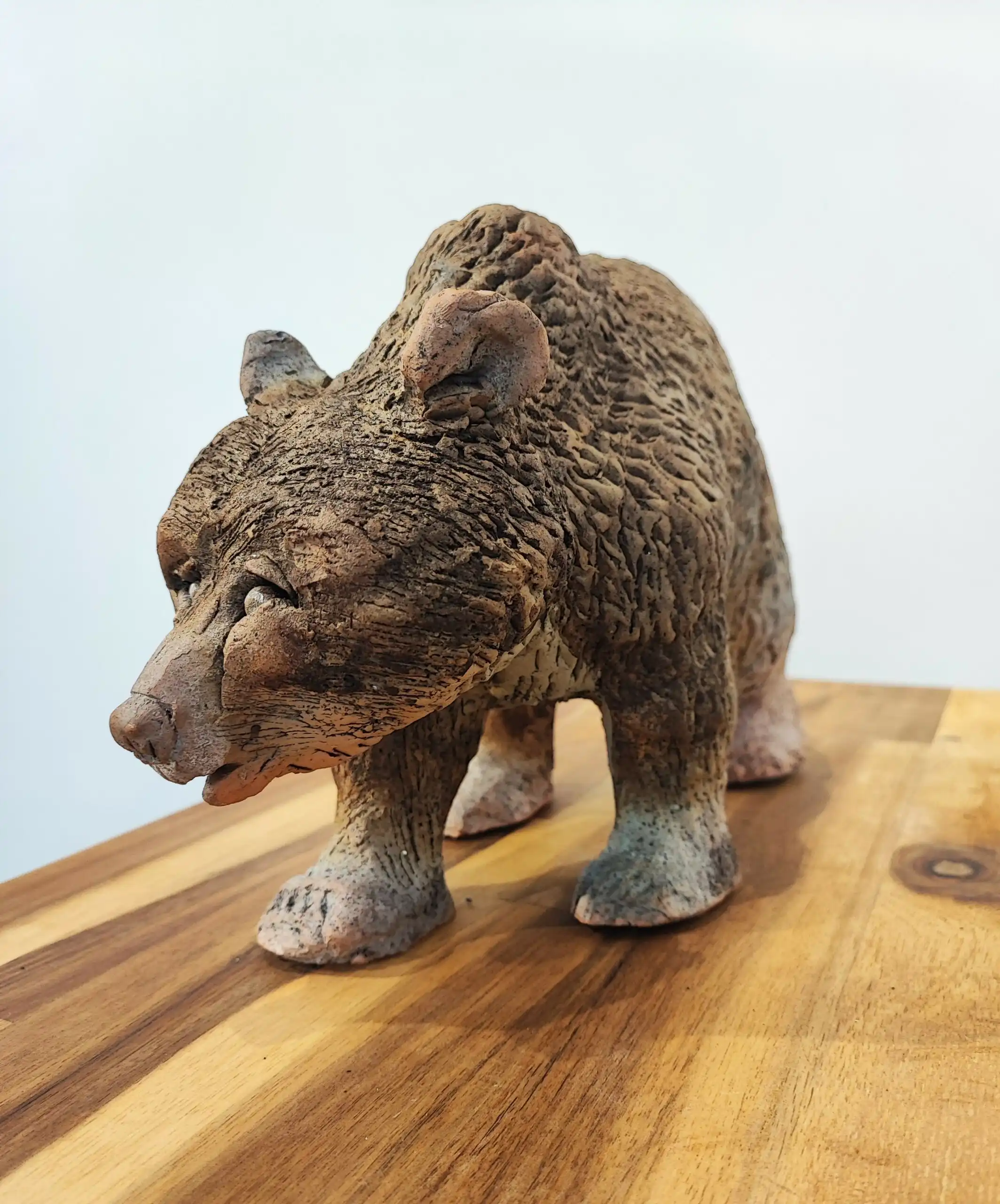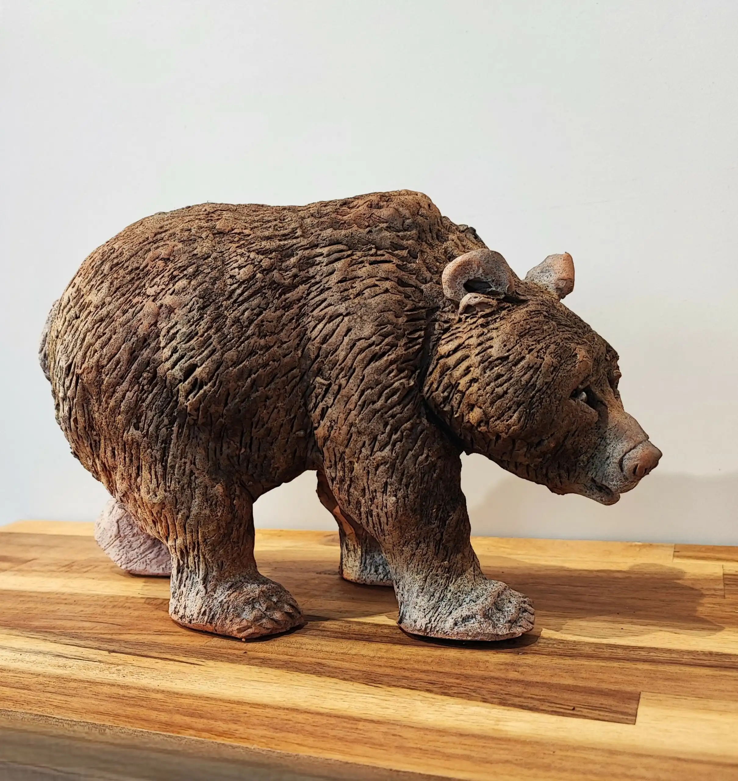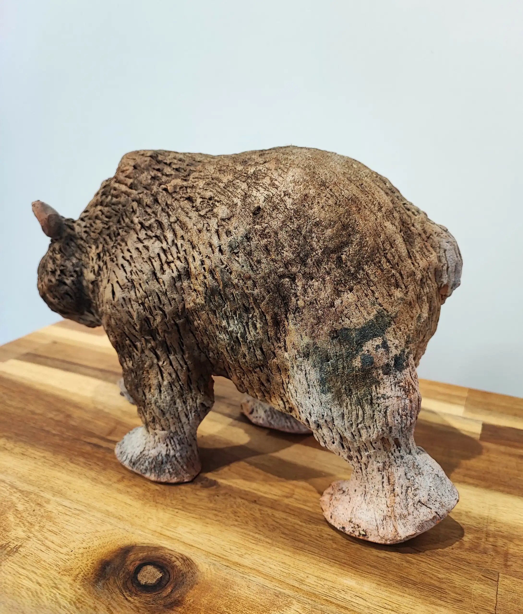 Cette sculpture captivante d’un nôtre en marche impressionne par sa précision réaliste et son exécution méticuleuse. Le matériau utilisé imite avec finesse la texture dense et fournie de sa fourrure, créant une sensation de mouvement et de vitalité. Les nuances de brun et d’ocre apportent une profondeur visuelle à l’œuvre, soulignant le volume et la présence imposante de l’animal. Cette œuvre, à la fois robuste et élégante, incarne une maîtrise technique remarquable et une sensibilité artistique qui transcende la simple figuration animale pour inviter à une réflexion sur la nature et sa majesté.