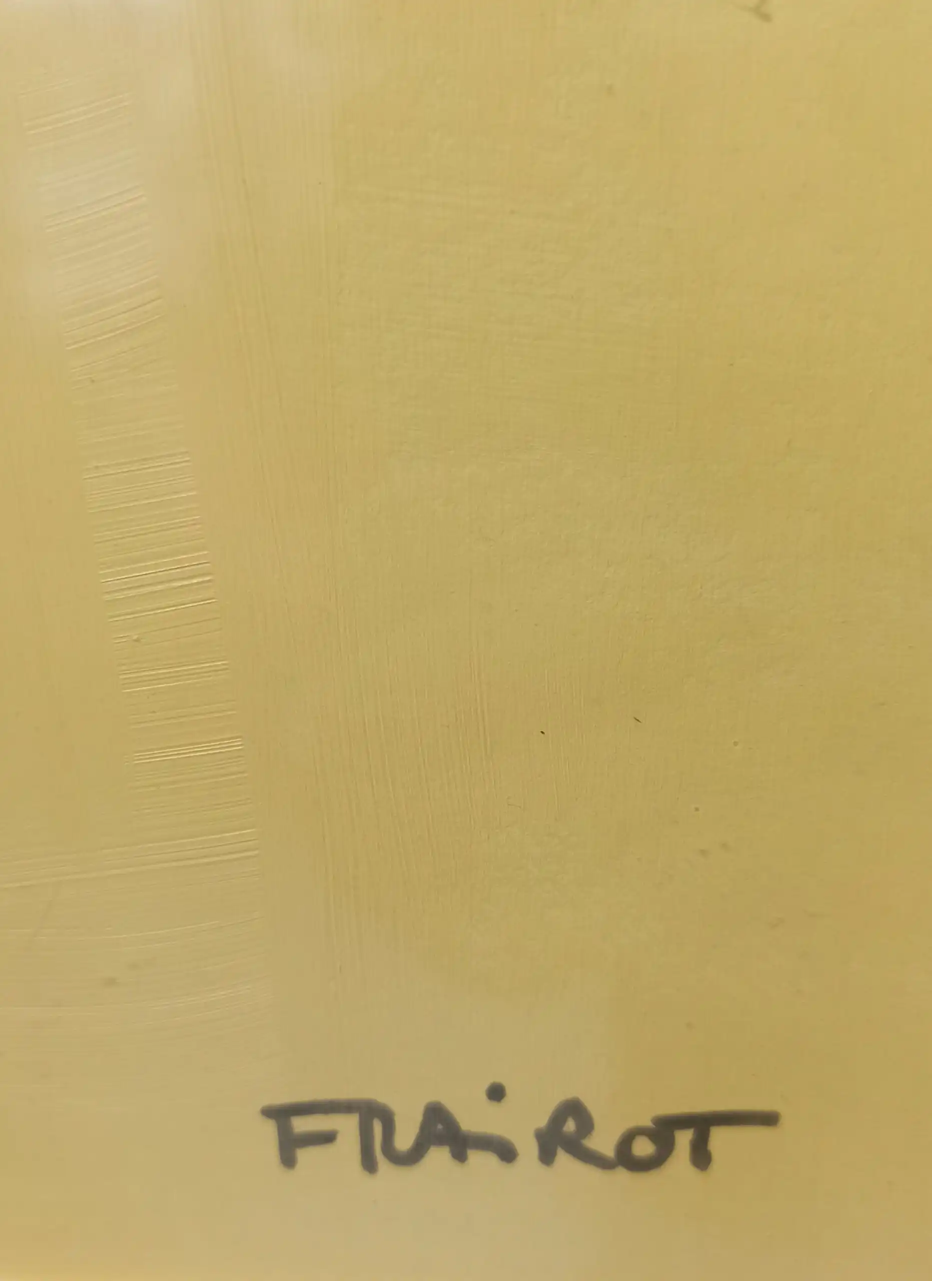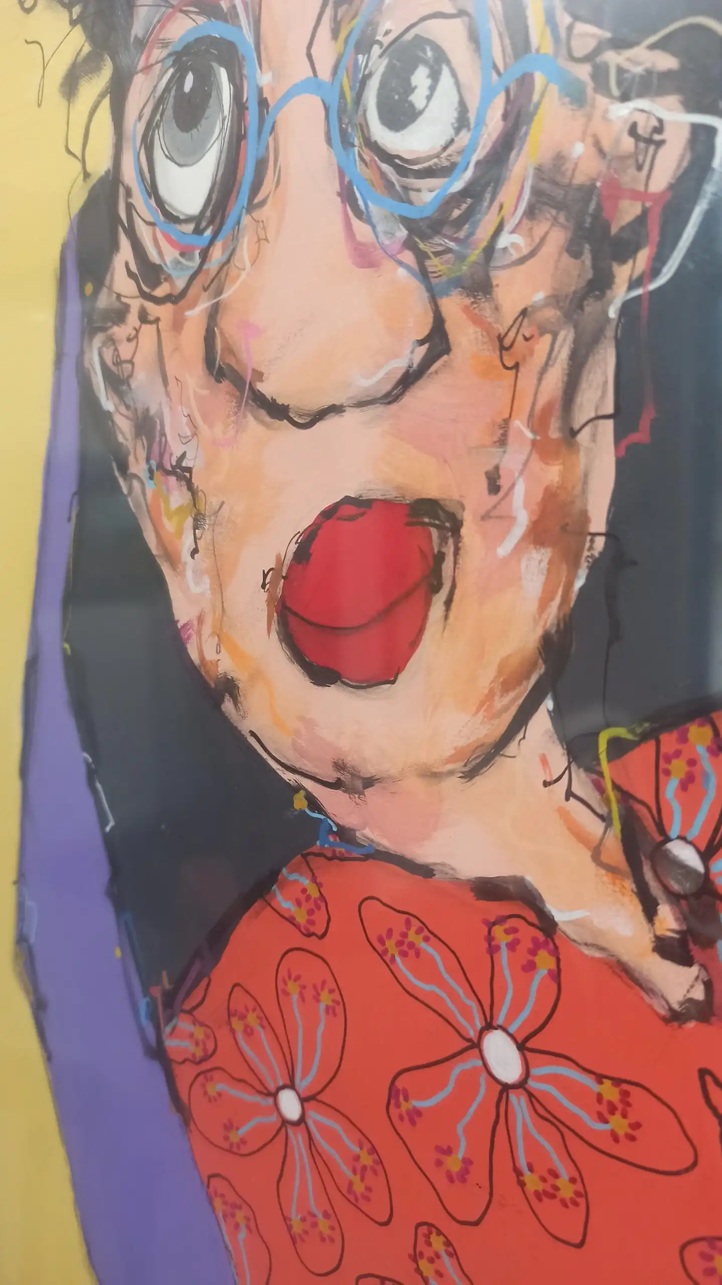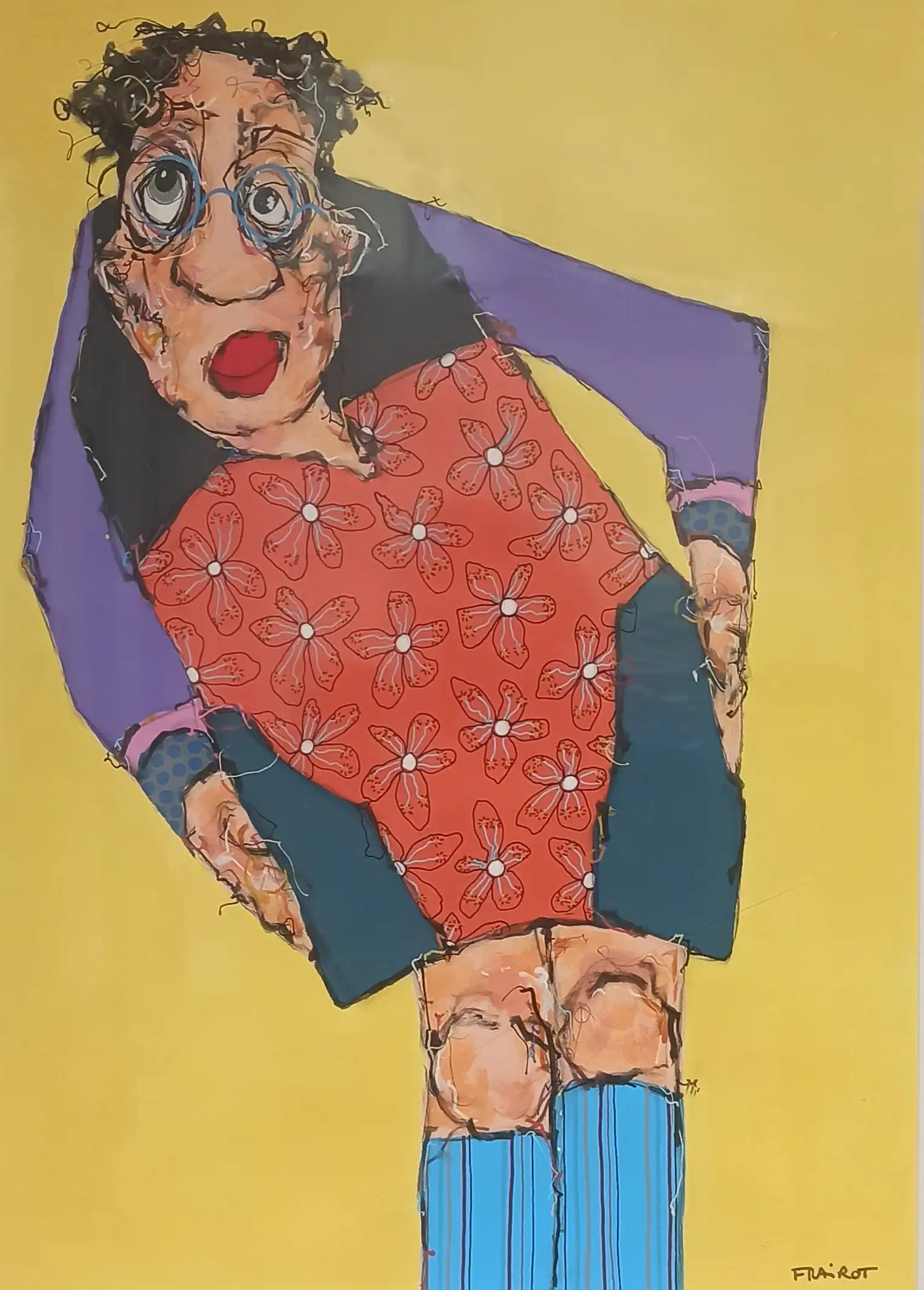 Cette œuvre audacieuse présente un personnage stylisé au regard intrigué, se distinguant par des traits exagérés et des couleurs vibrantes. Sur un fond jaune éclatant, la silhouette se penche légèrement, captivant l’observateur avec son visage disproportionné aux grandes lunettes. La robe rouge, sertie de motifs floraux blancs, contraste audacieusement avec les bras recouverts de manches violettes. Les jambes montrent des genoux expressifs, offrant une posture dynamique, et se terminent par de longs bas bleus. L’artiste utilise une technique de dessin marquée, donnant une texture brute et énergique à l’ensemble, ce qui accentue le caractère unique et ludique de l’œuvre. Cette peinture fusionne humour et critique subtile, évoquant à la fois l’absurdité et la profondeur des émotions humaines.