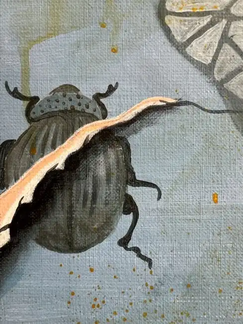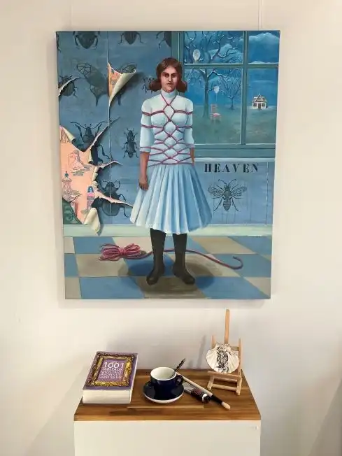 pratique japonaise du Shibari. Les insectes du papier peint bleu, sont un motif récurrent dans mon travail, liée à une fascination personnelle. Enfin, le papier peint déchiré, qui est aussi un motif récurrent dans mon travail, symbolise le temps qui passe, les apparences, les déchirures…