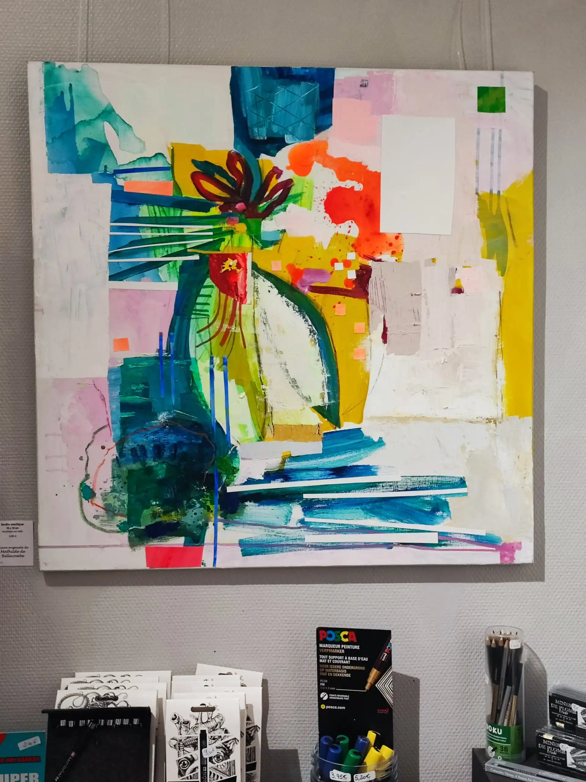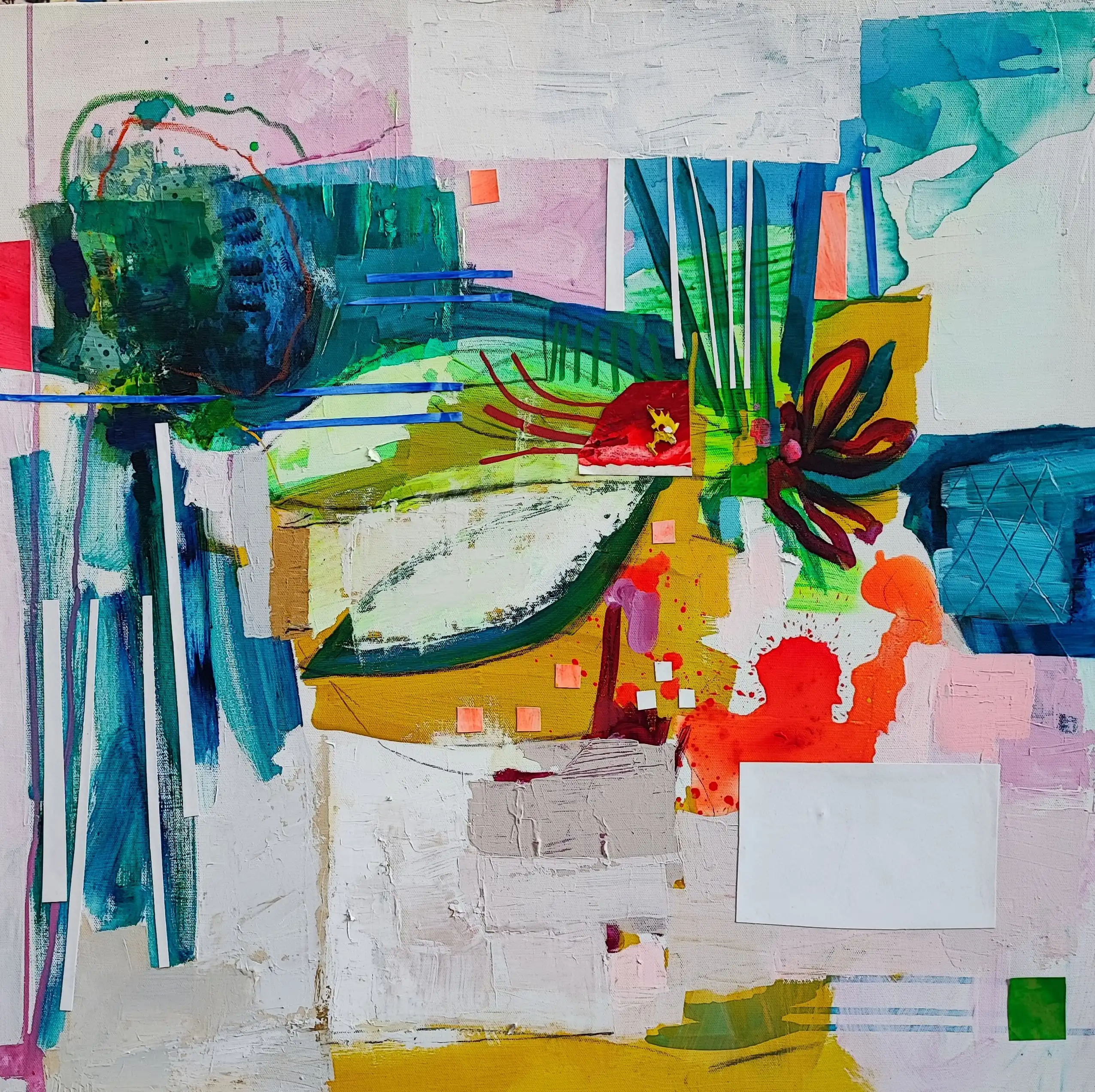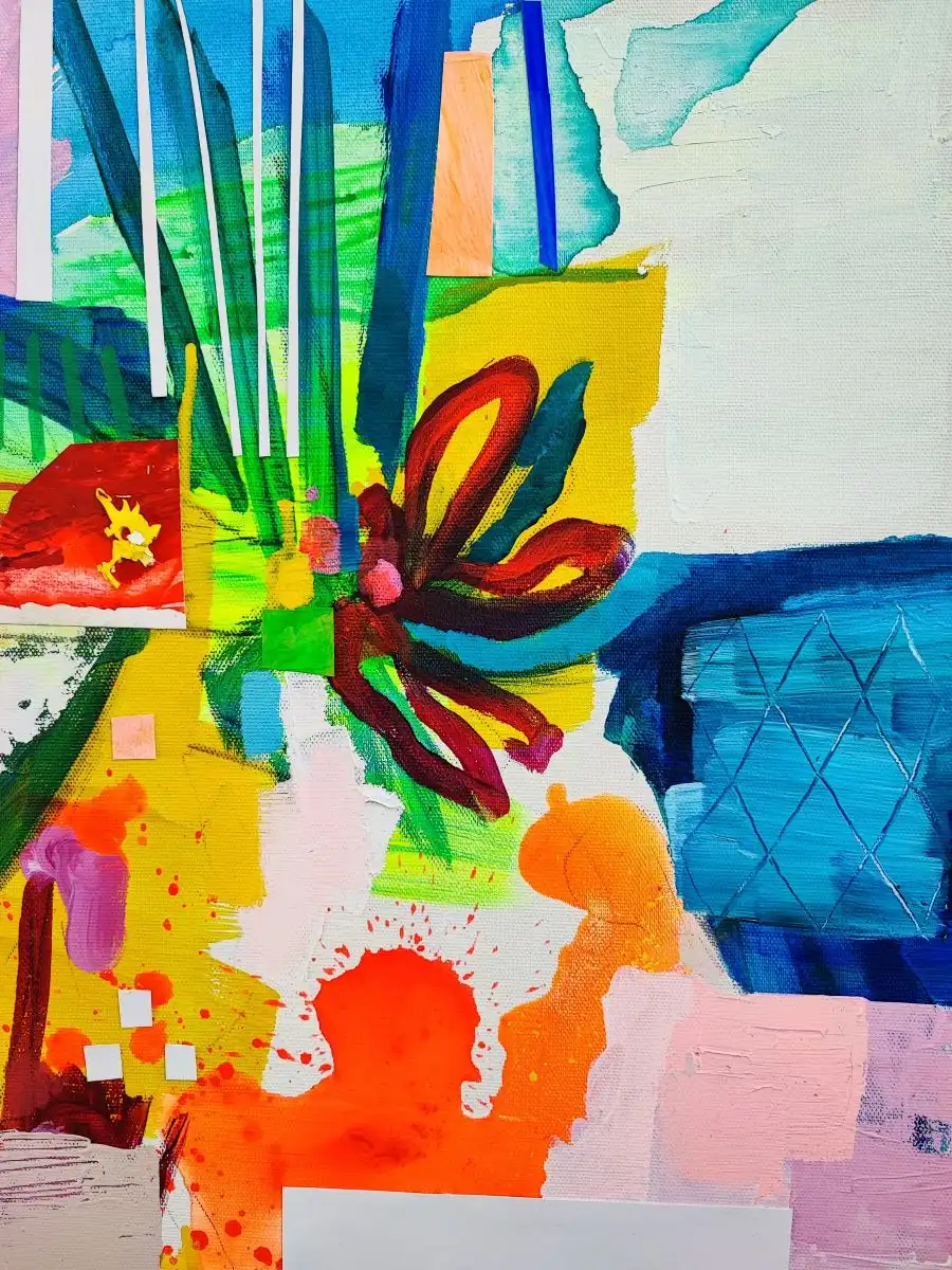 Ce tableau dynamique utilise une palette vibrante pour captiver l’œil. Les formes géométriques et les coups de pinceau expressifs se côtoient, créant une tension entre l’ordre et le chaos. Des nuances éclatantes de bleu, rose, jaune et vert se mêlent harmonieusement, évoquant une atmosphère à la fois chaotique et contrôlée. L’interaction des textures, combinant aplats et traits nerveux, confère à l’œuvre une profondeur visuelle intrigante. Un motif floral central, stylisé et abstrait, émerge parmi les couleurs éclatantes, ajoutant une dimension organique au tableau. Ce mélange audacieux de formes abstraites et de couleurs vives témoigne de la maîtrise technique et de l’innovation artistique de l’auteur. Cette œuvre incite à la contemplation et à la découverte des subtilités visuelles cachées dans chaque recoin.