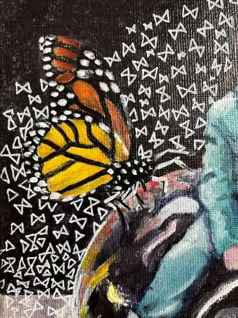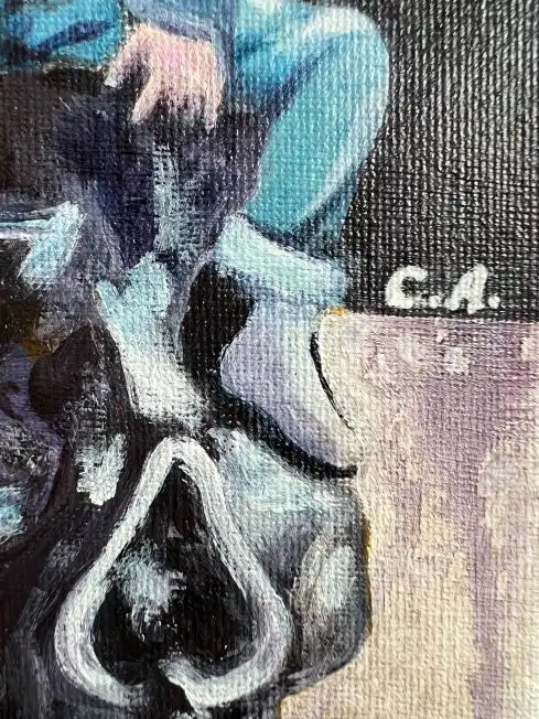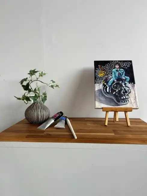 Cette petite peinture mettant en scène une petite fille chevauchant une vanité est à la fois une représentation de la vie, dans sa durée, et un clin d’œil au symbole de la vanité, généralement associée à la mort et que je préfère associer à la vie. J’ai l’habitude de dire que sans squelette nous ne serions pas debout.