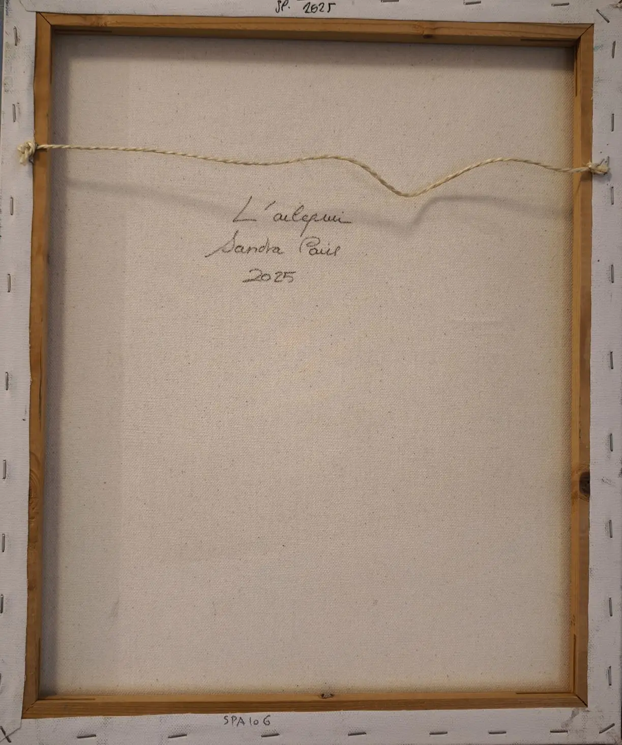 Cette œuvre se présente sous la forme d’une carte de tarot divinatoire comme le souligne la bordure colorée ainsi que les petites étoiles présentes aux quatre coins du tableau.