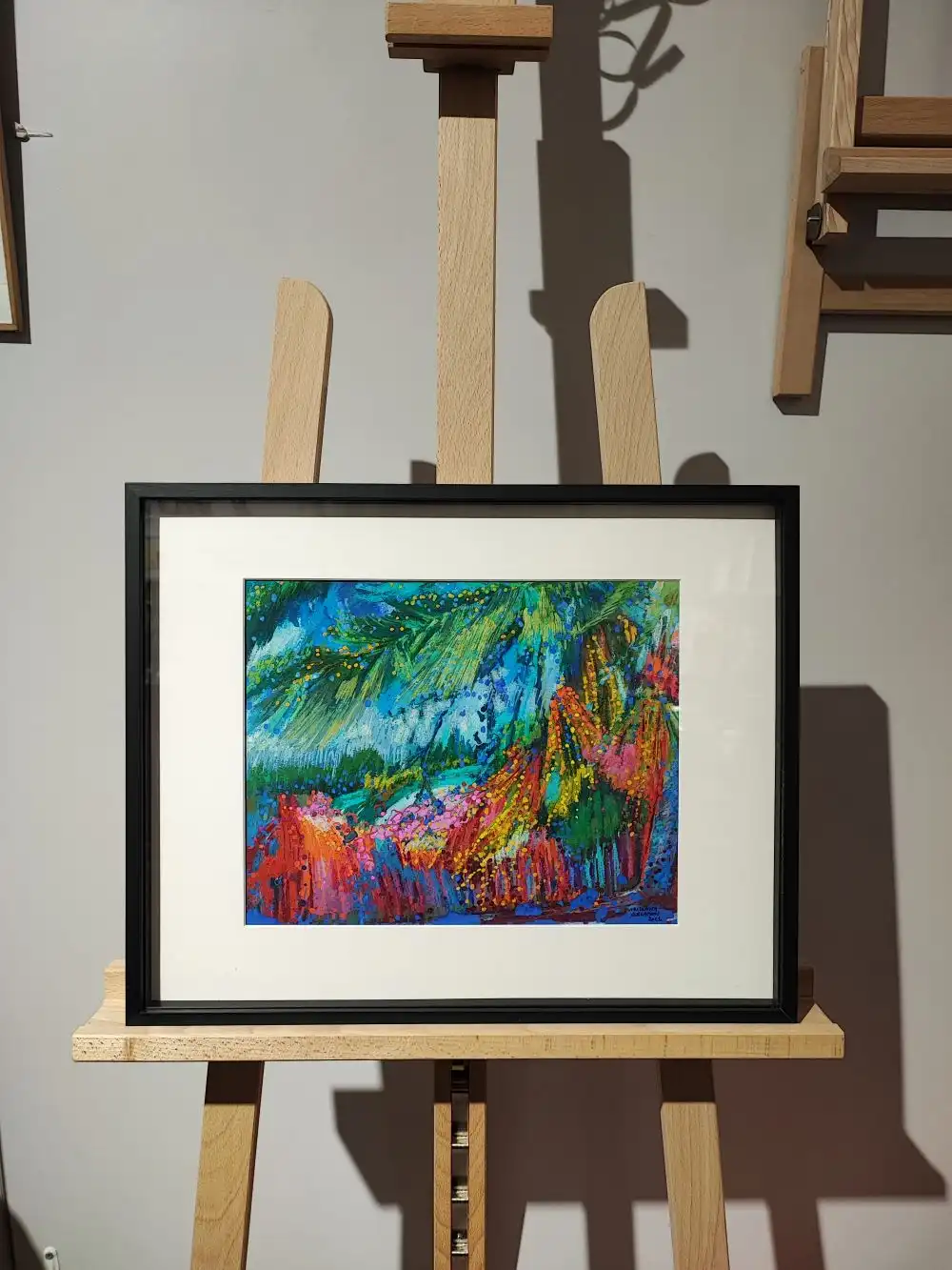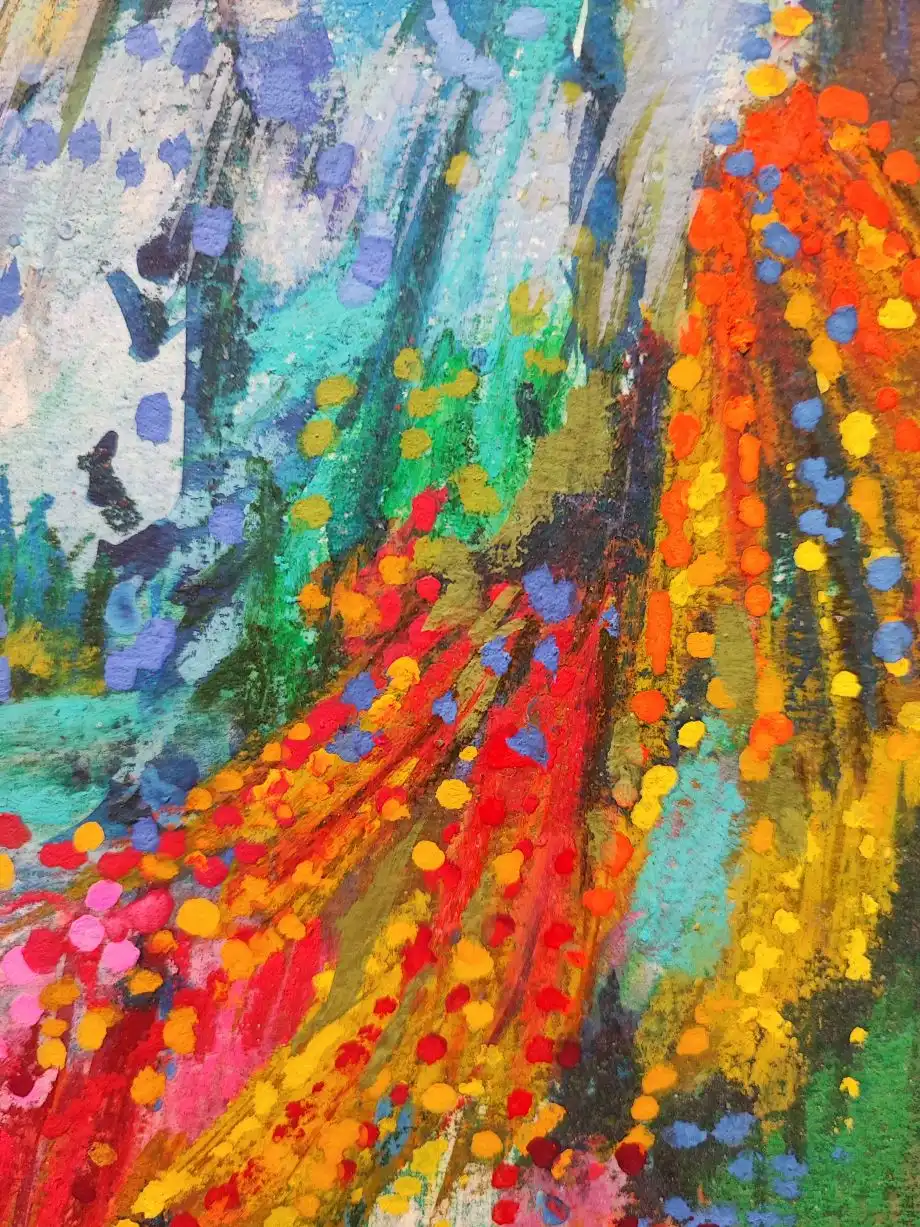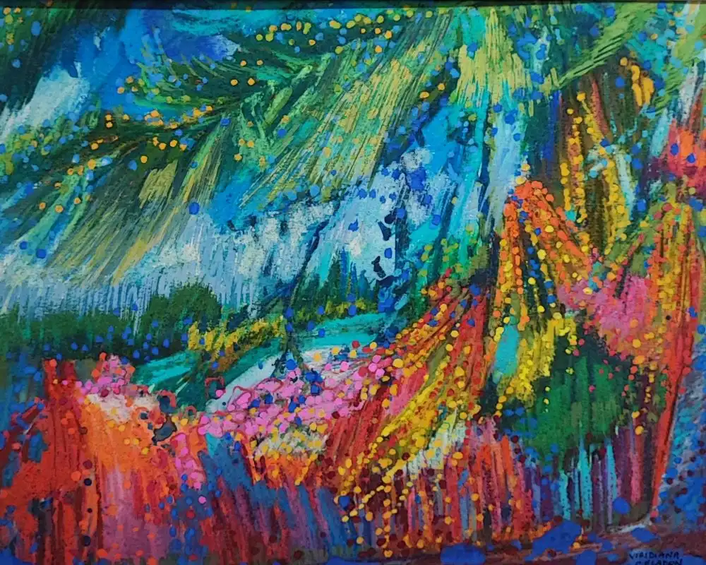 Cette œuvre éclatante capture un paysage abstrait vibrant de couleurs. Les coups de pinceau dynamiques et les teintes vives de bleu, vert, rose et orange créent un tourbillon visuel d’énergie. Les touches de jaune et de vert vif illuminent la scène, évoquant la lumière du soleil perçant à travers une canopée dense.