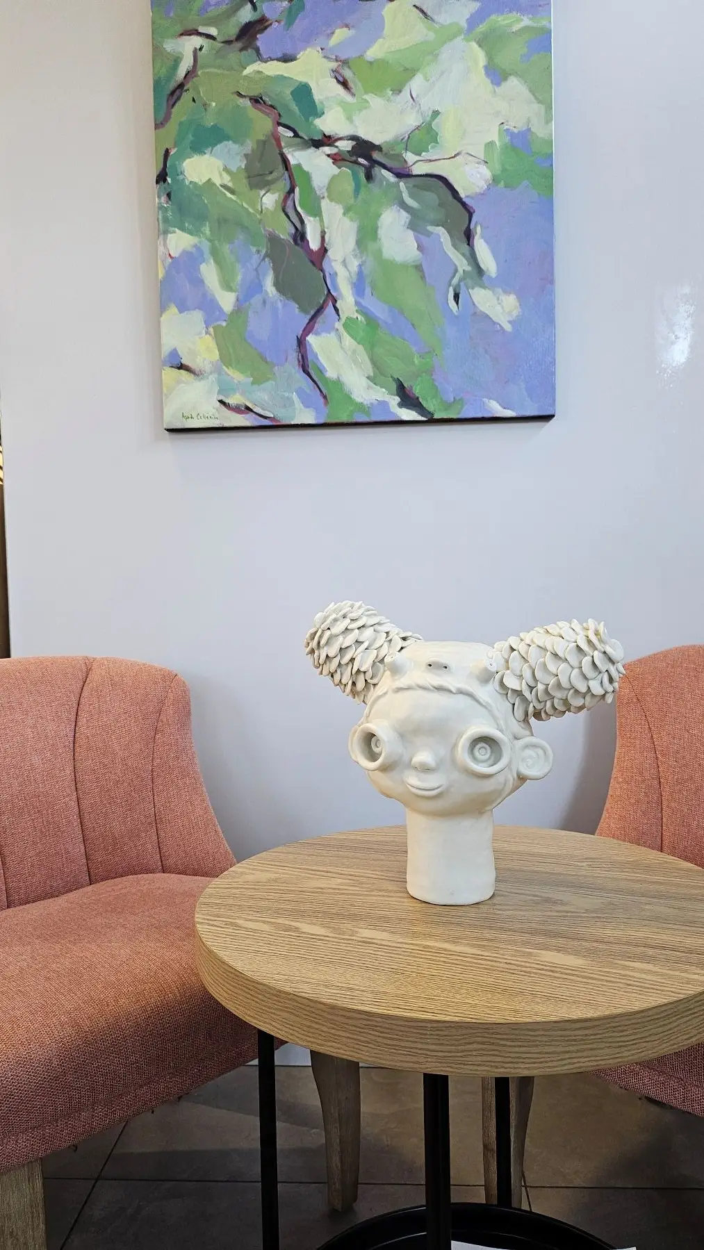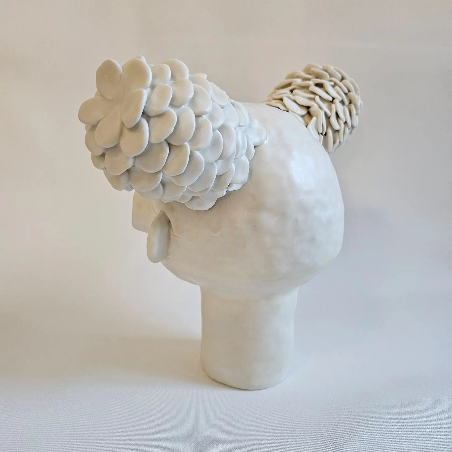 Les grosses lunettes d’aviateur et le petit sourire béat nous font tomber sous le charme. Comme beaucoup de sculptures de l’artiste, celle-ci représente un être hybride. La coiffe du personnage anthropomorphique est un autre être avec des narines, des yeux et dont les deux protubérances de feuilles délicatement pastillées par l’artiste semblent représenter deux exubérantes couettes de cheveux.