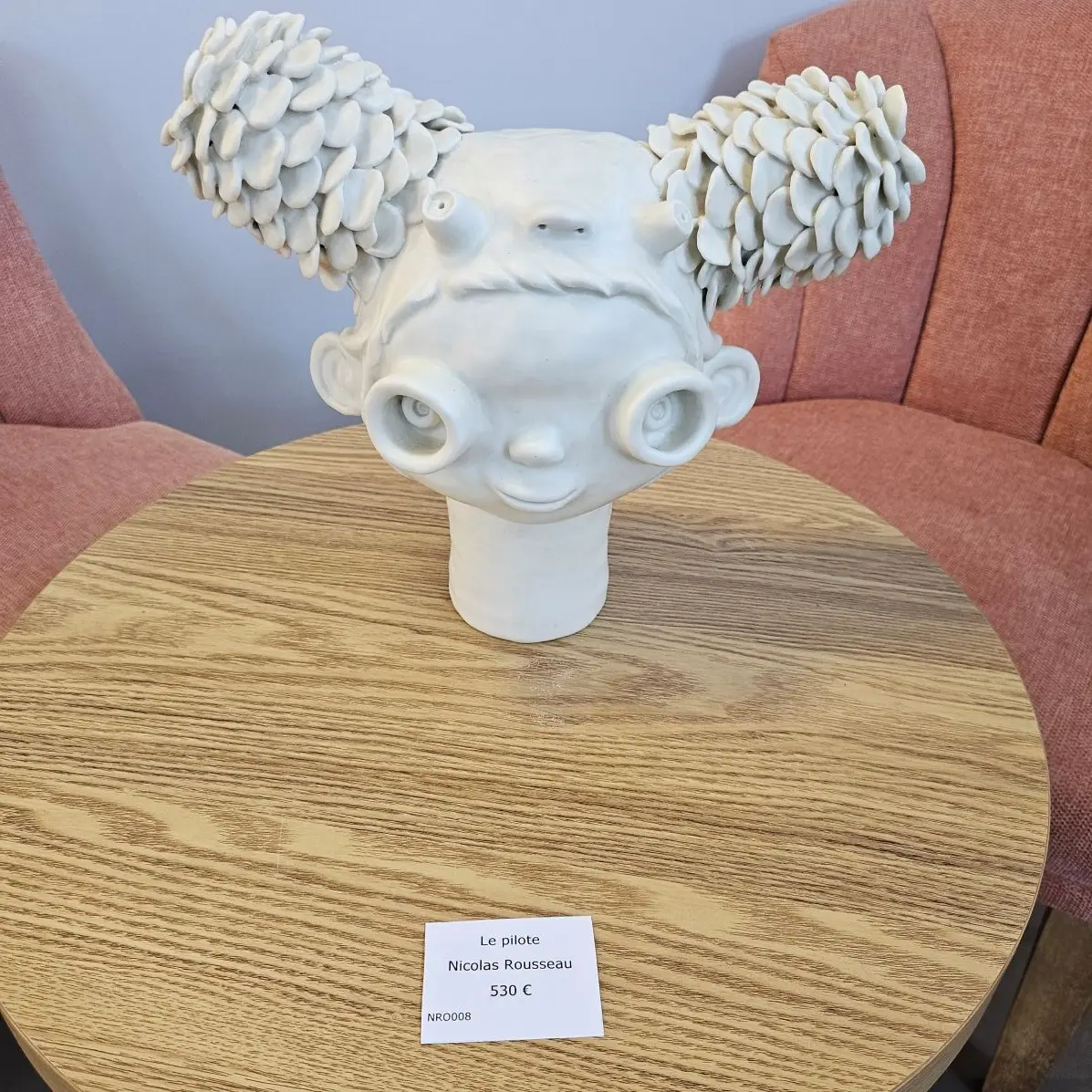 Cette sculpture en porcelaine nous donne le sourire immédiatement. Elle représente la tête d’un personnage féminin qui semble tiré d’un des dessins animés japonais ou Manga qui ont nourri l’imaginaire du céramiste Nicolas Rousseau.