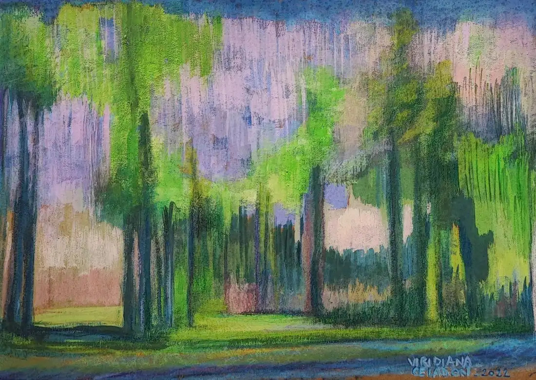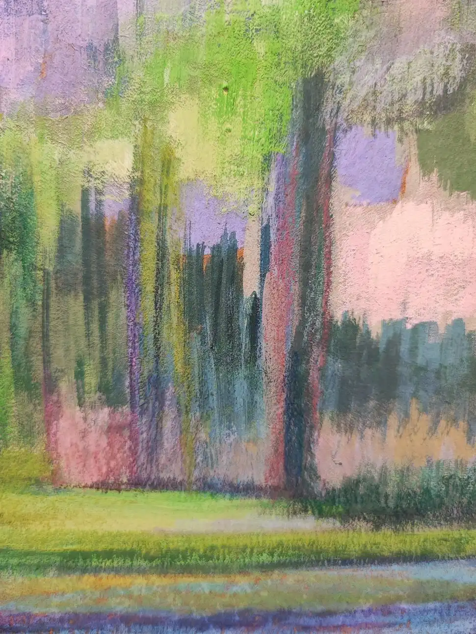 Cette œuvre d’art présente un paysage vibrant qui capte l’essence d’une forêt enchantée. Les arbres élancés, peints avec des touches vertes et bleues, créent une profondeur saisissante. Les nuances de violet et de rose du ciel diffusent une lumière onirique sur la scène, évoquant un crépuscule mystique.