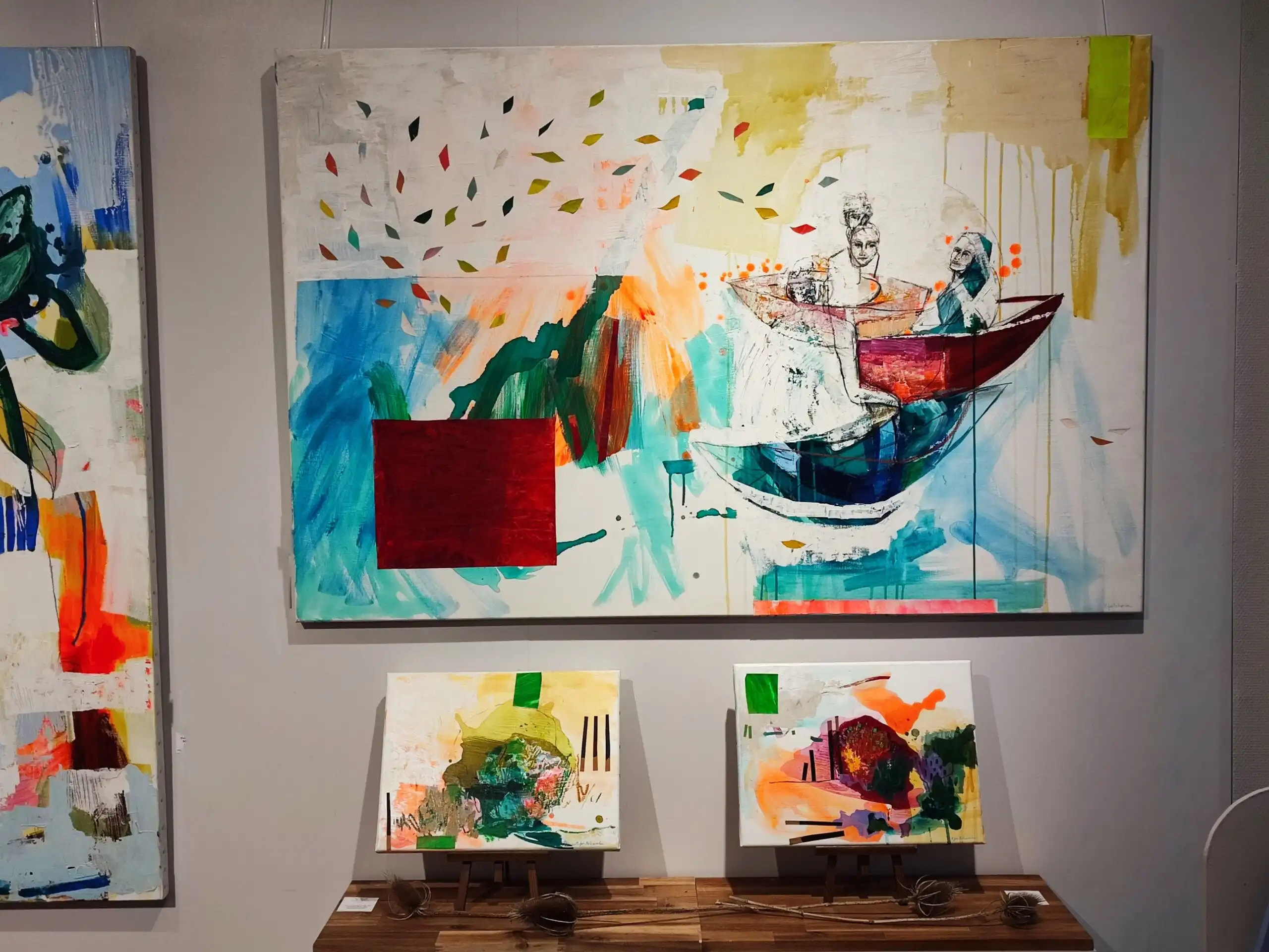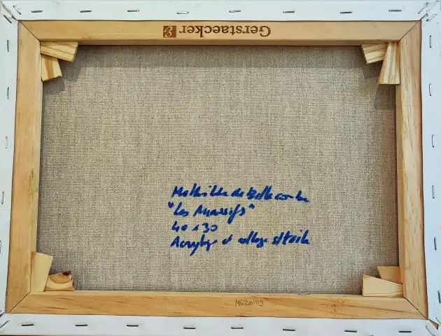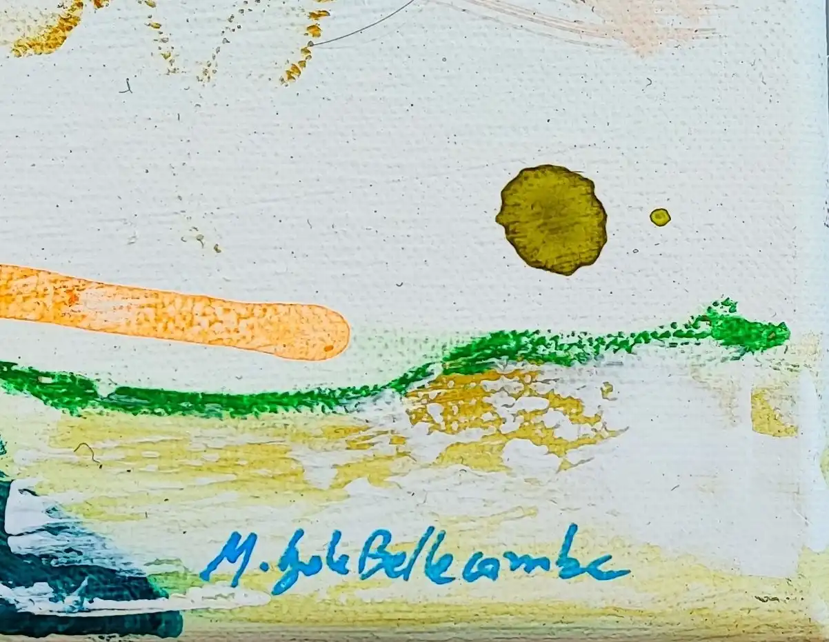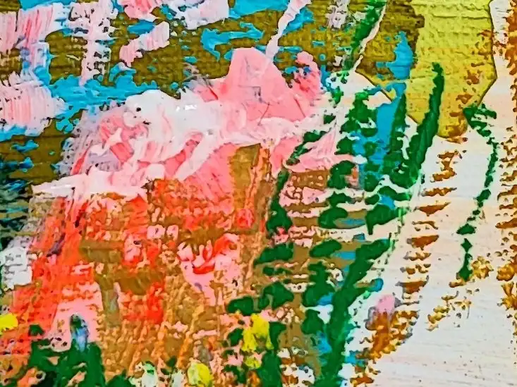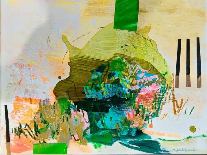 Cette œuvre abstraite déborde d’énergie et de dynamisme grâce à son mélange audacieux de couleurs et de formes. Dominée par des teintes vibrantes de vert, turquoise et rose, une masse centrale complexe capte immédiatement le regard. Les touches de vert fluo créent un contraste saisissant, introduisant un élément de fraîcheur. Des lignes noires verticales à droite ajoutent une structure graphique et équilibrent la composition. Le fond est un dégradé subtil de tons chauds, beige et pêche, apportant une douceur qui nuance l’intensité des couleurs vives.