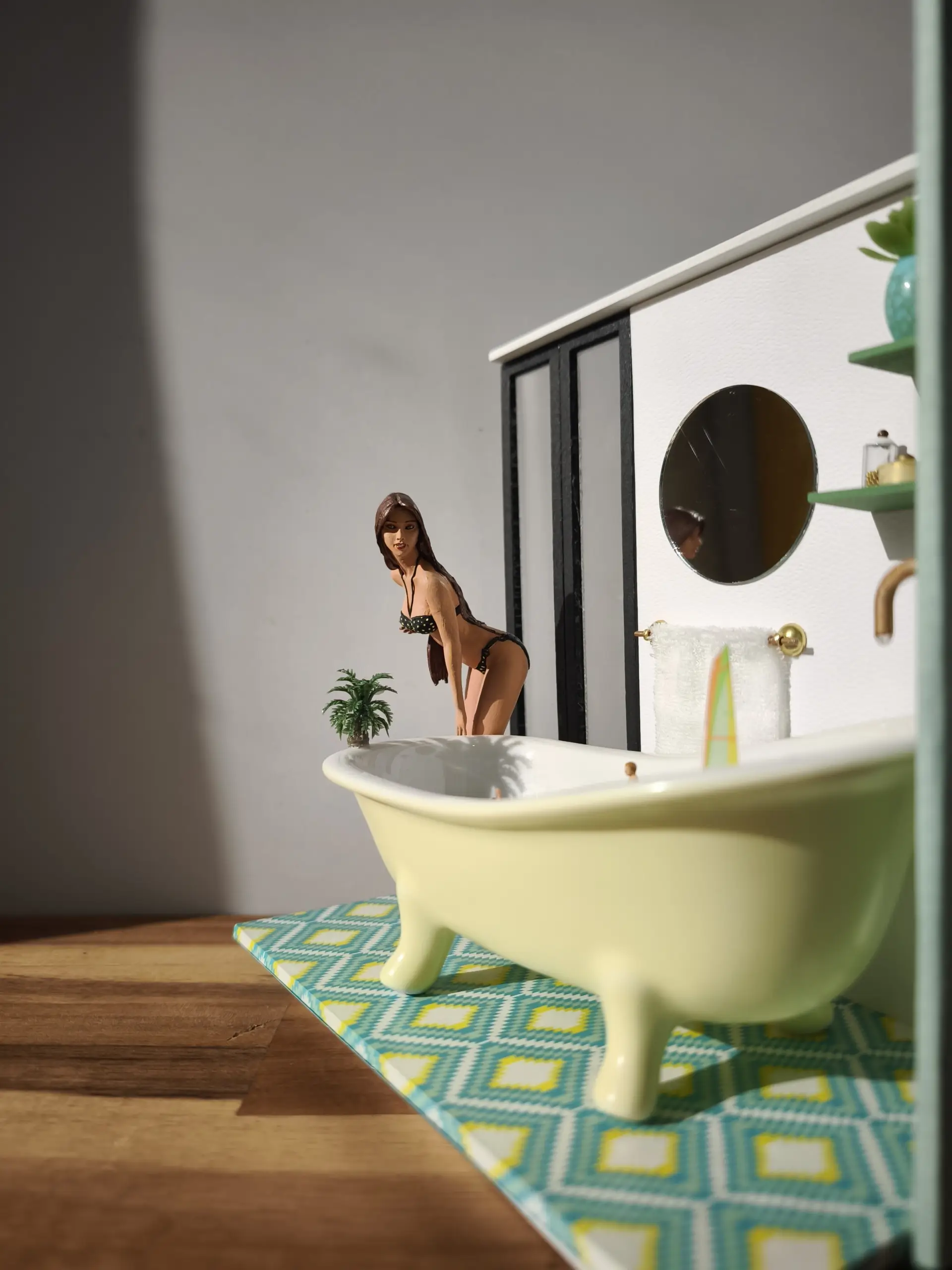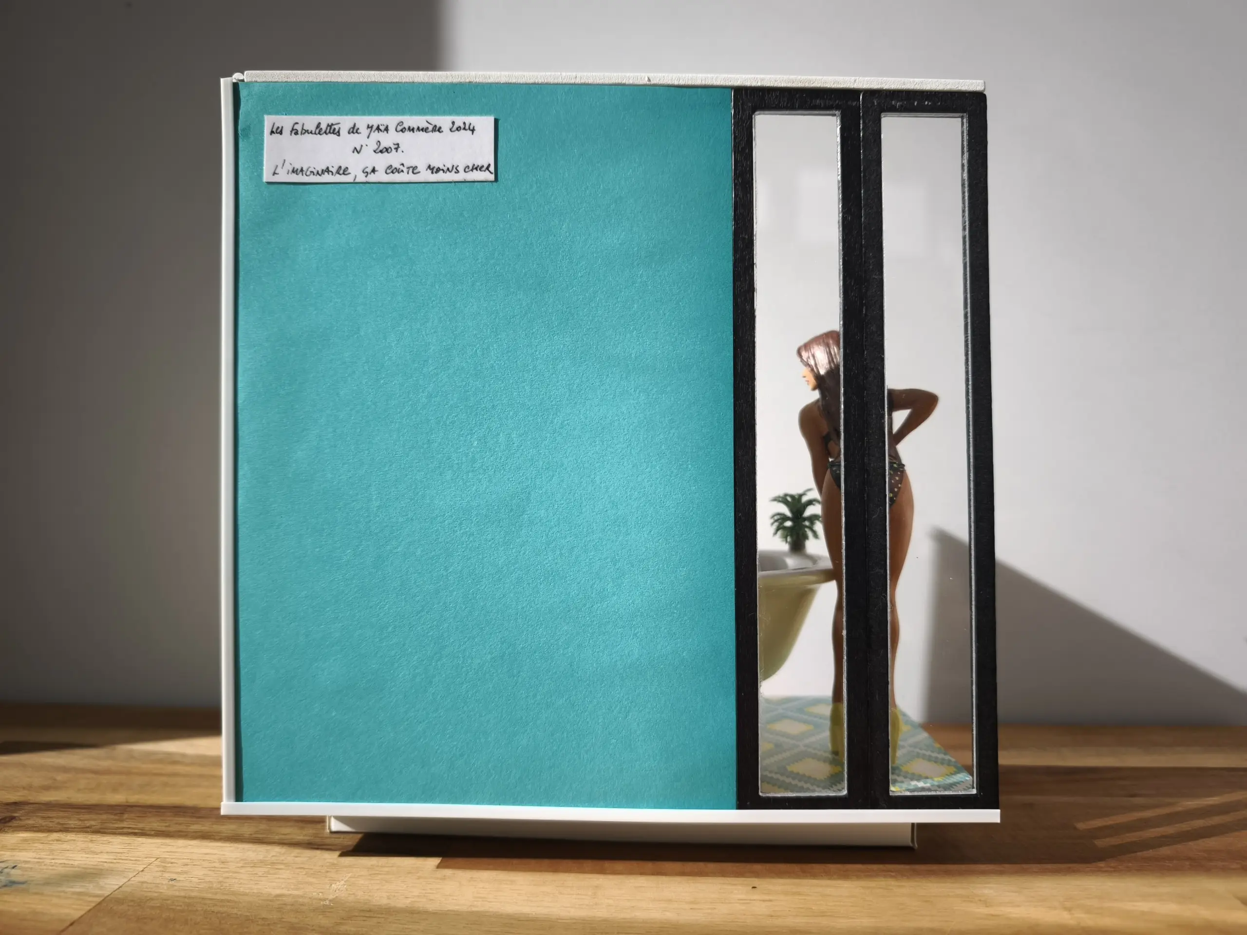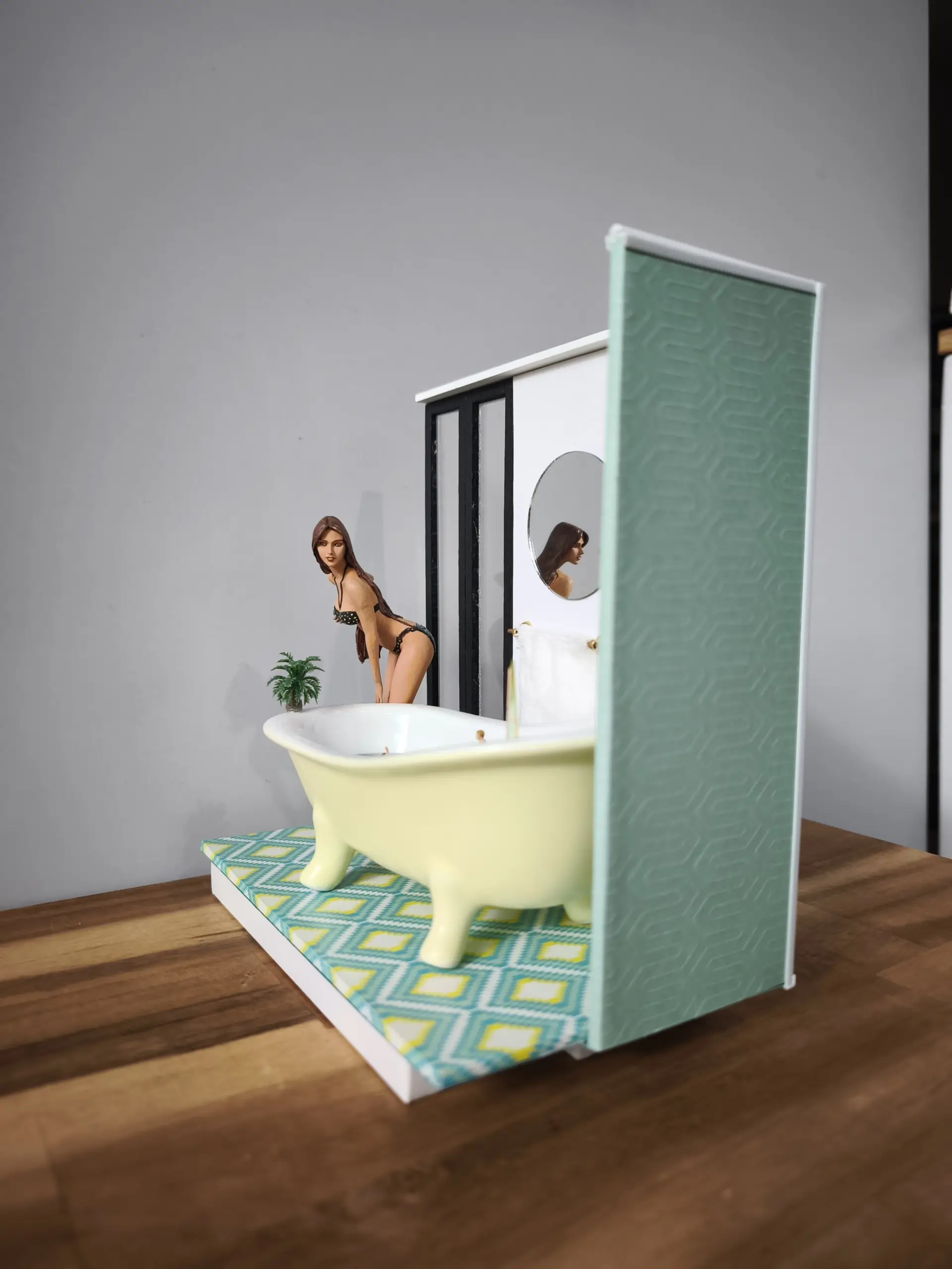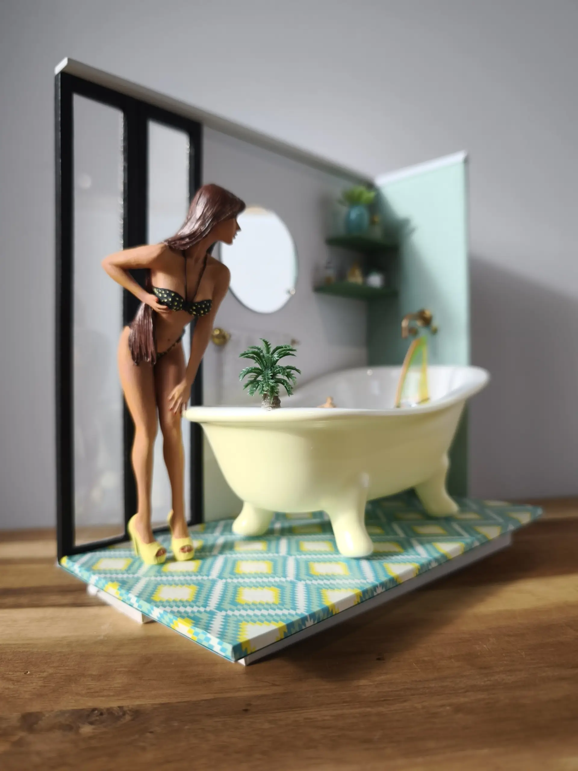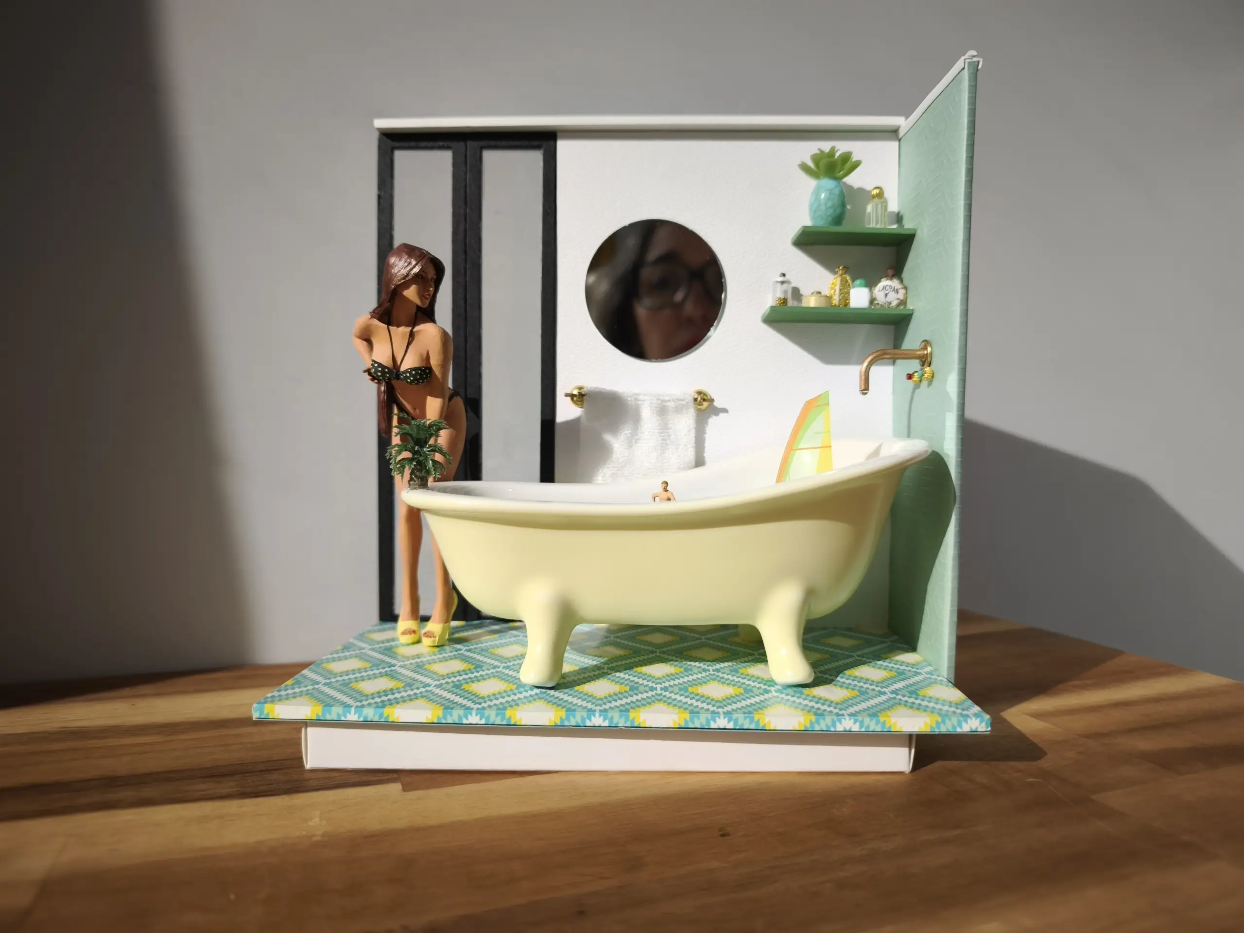 Résine, carton, papier, plexi, baignoire en porcelaine.