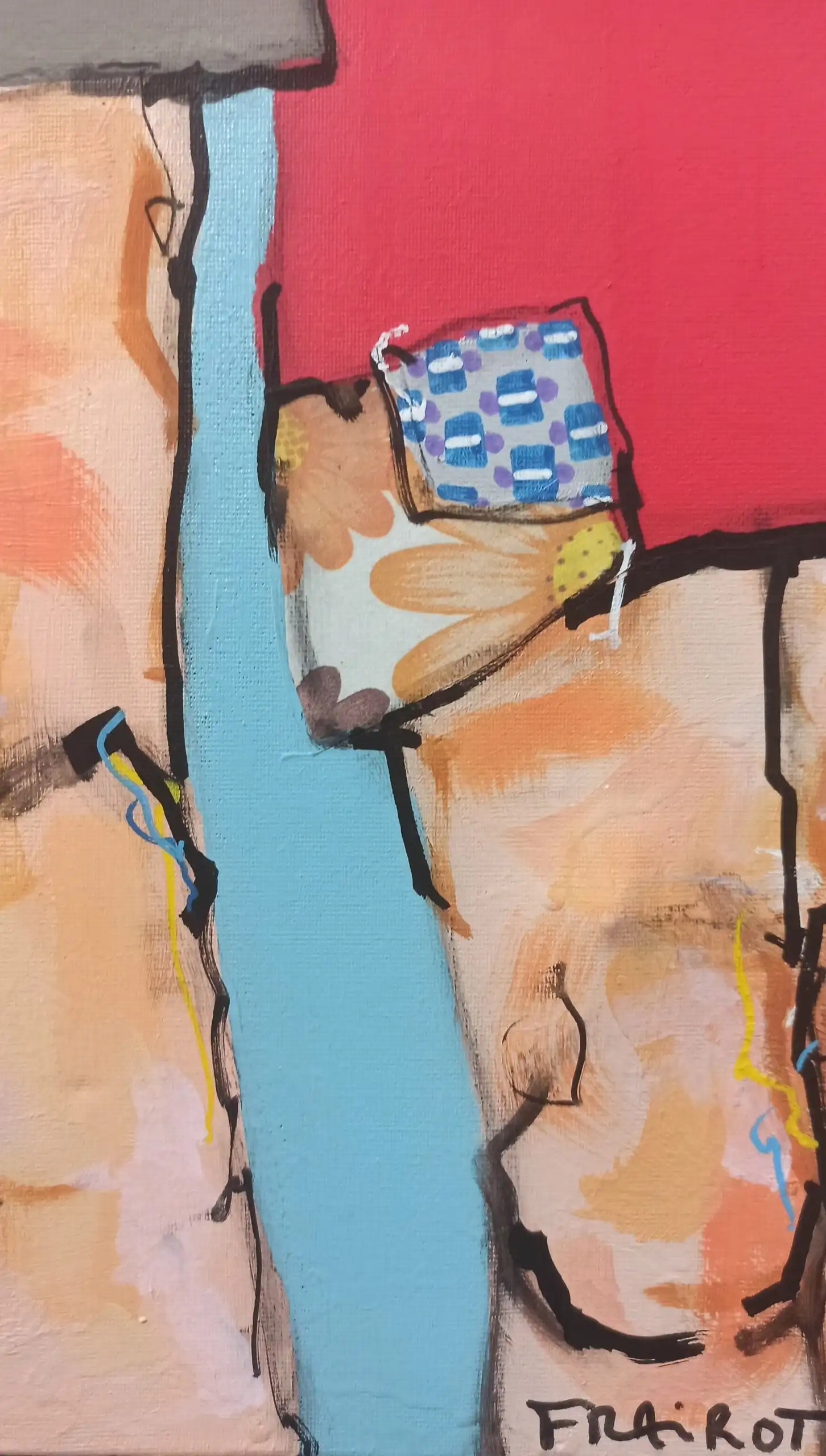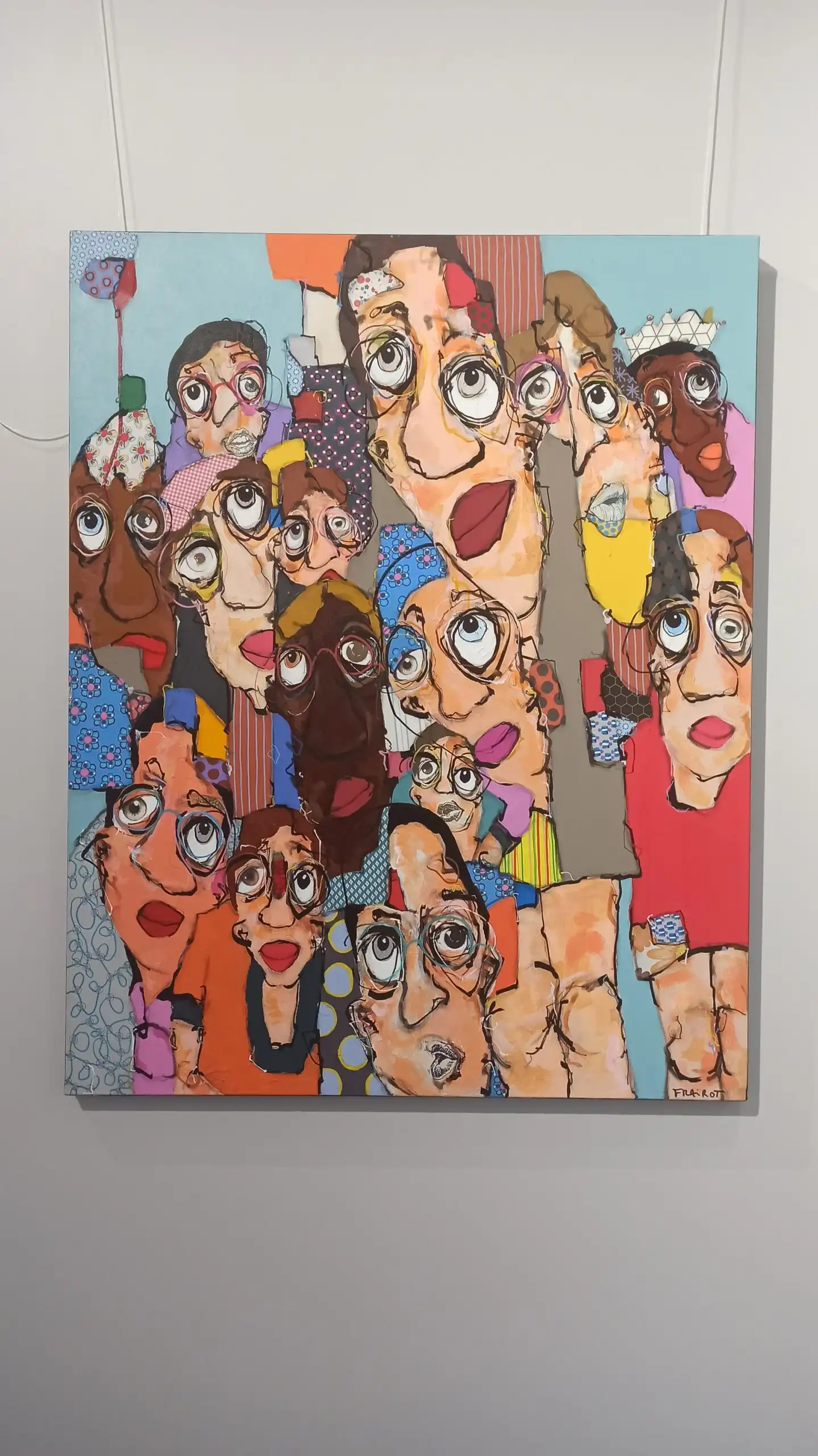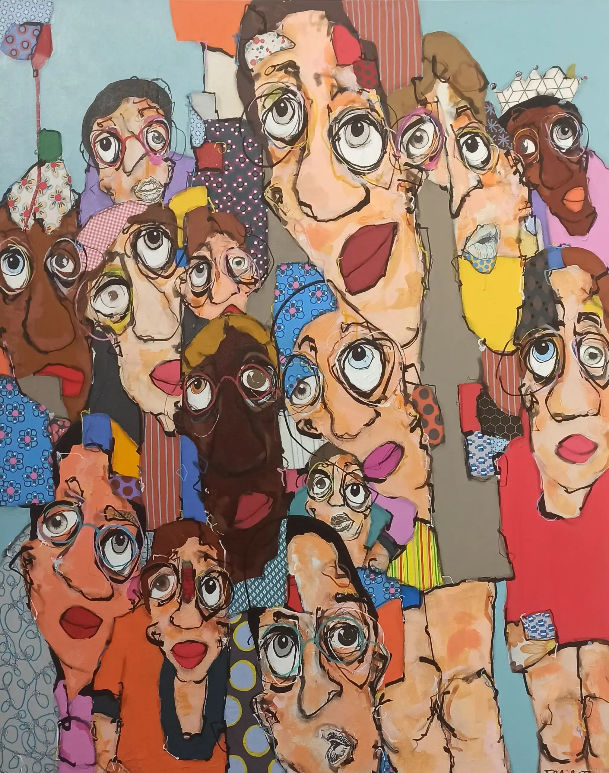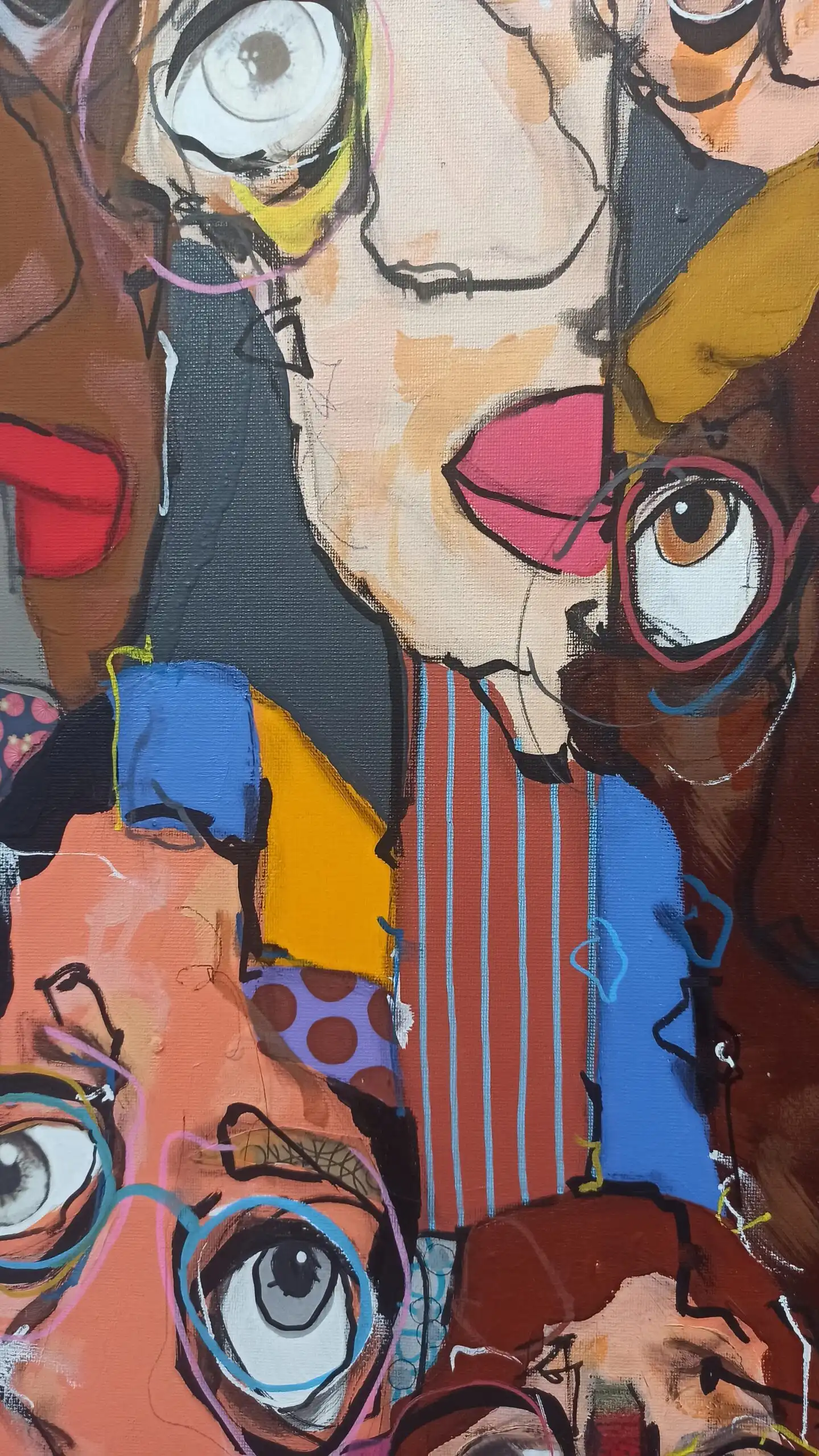 Cette œuvre d’art, vibrante et audacieuse, présente une composition de figures humaines aux contours exagérés et expressifs, s’affichant avec des visages grands et caractéristiques. Les personnages sont fusionnés dans une harmonie désordonnée, formant un ensemble captivant qui attire le regard. Le recours à des couleurs vives et contrastées génère une énergie palpable. Les teintes de jaune, rouge, bleu et violet sont utilisées avec une intensité ludique, conférant une vitalité joyeuse à la scène. Chaque personnage se distingue par des motifs vestimentaires distincts — pois, rayures et unies — qui ajoutent un élément de diversité et d’individualité. Les expressions des visages, aux yeux larges et contemplatifs, reflètent une gamme fascinante d’émotions : surprise, curiosité, réflexion.