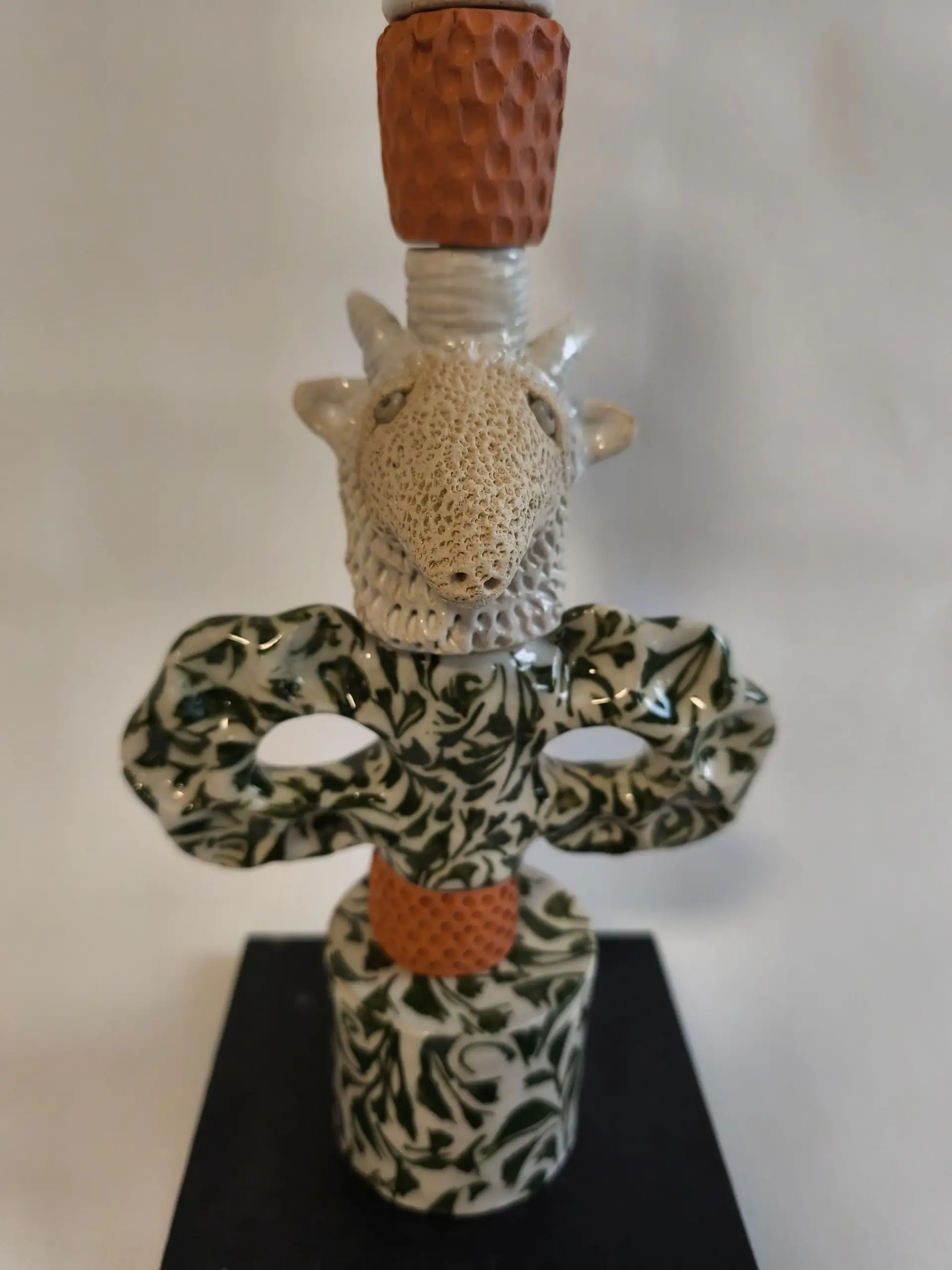 Ce totem bouc mêle ainsi la tête d’un bouc, d’un personnage ainsi que des éléments floraux peints dans un travail tout en délicatesse.