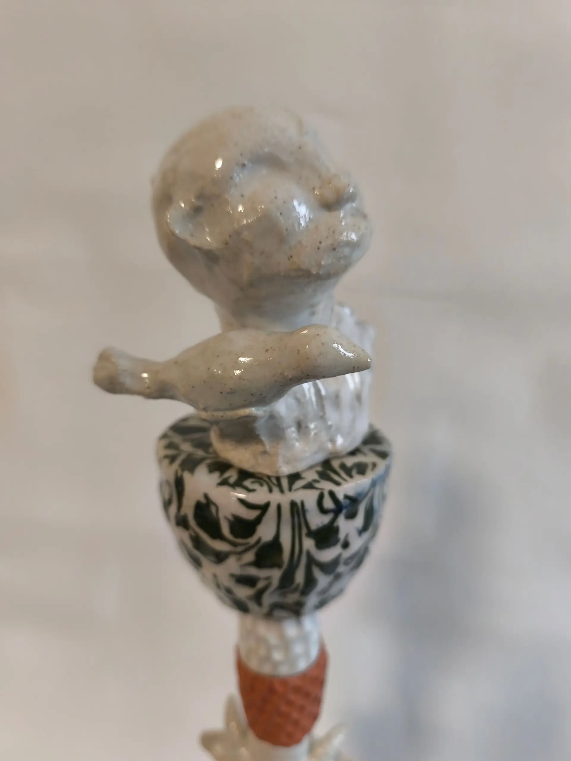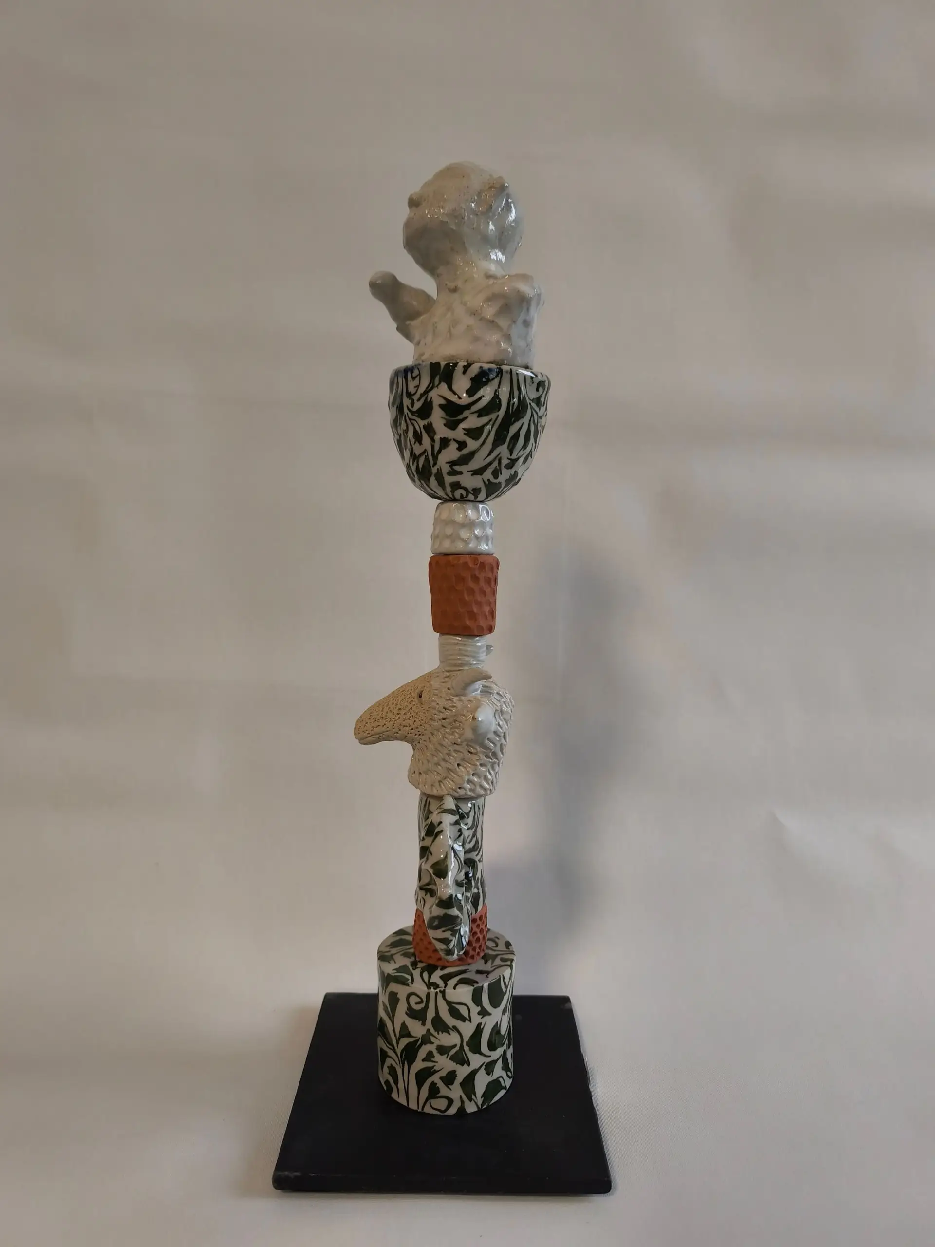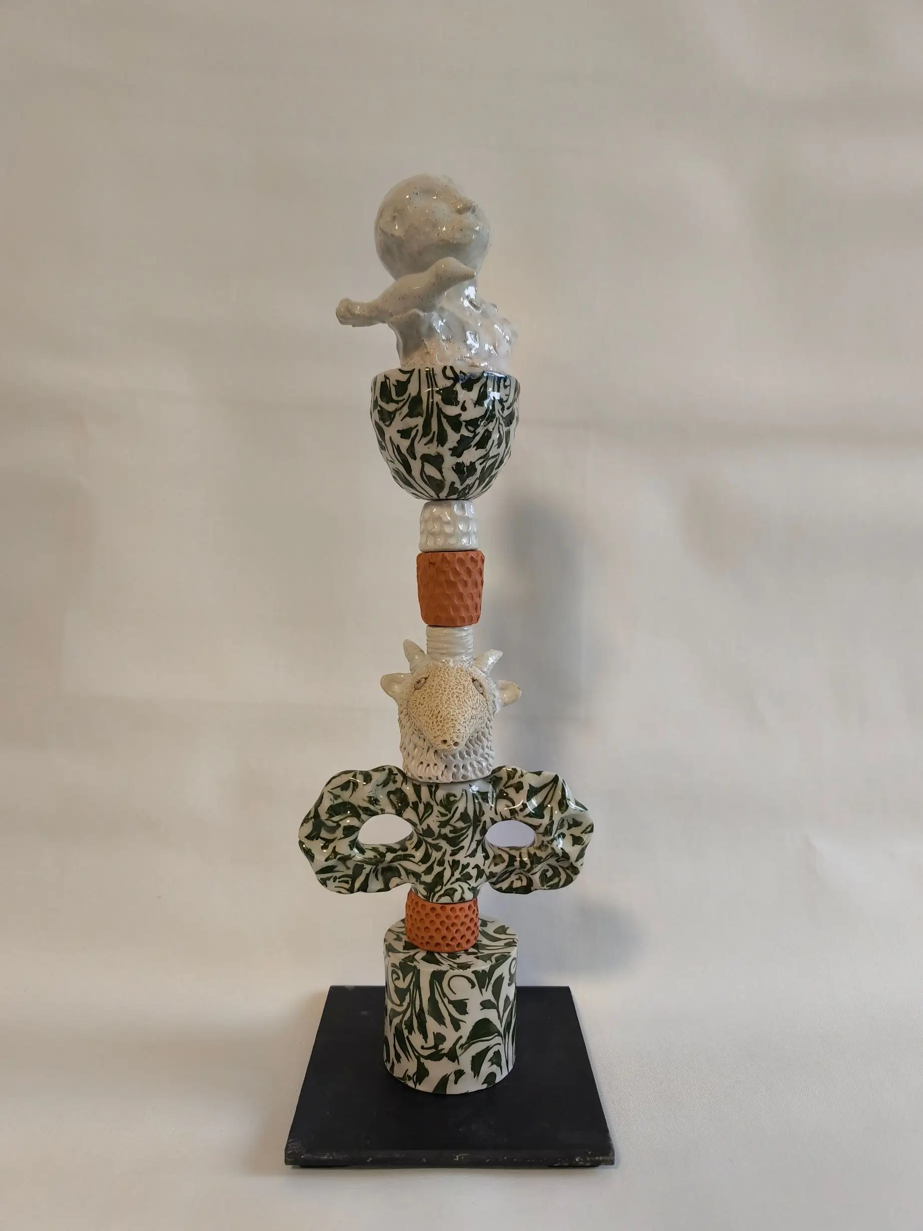 Cette sculpture en grès de l’artiste Béatrice Beaune se présente sous la forme de plusieurs éléments en grès qui s’enfilent sur un socle en métal pour former un totem.