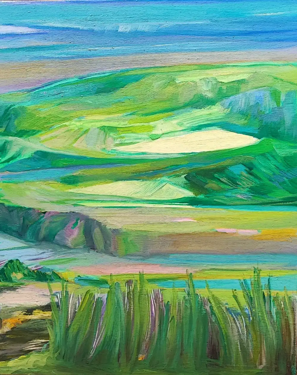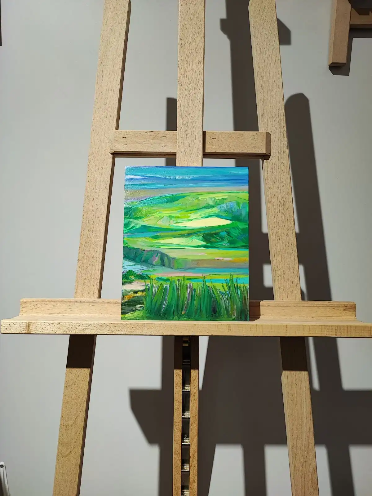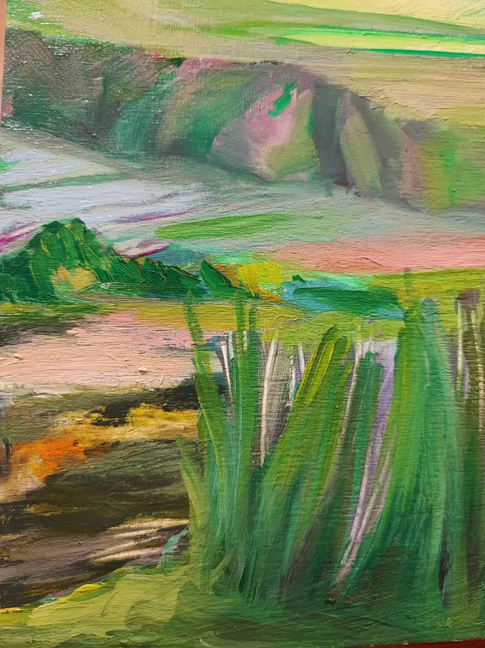 Ce tableau présente un paysage luxuriant et vibrant, dominé par une palette de verts éclatants, de bleus apaisants et de touches de jaune éclatantes. L’artiste capture habilement la dynamique de la nature à travers des coups de pinceau fluides et dynamiques qui confèrent à l’œuvre une sensation de mouvement incessant.