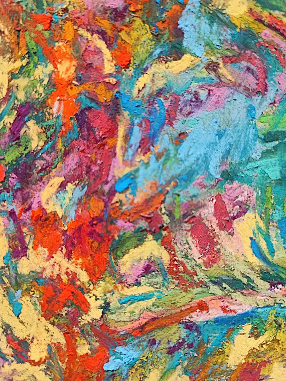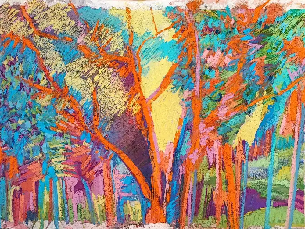 Ce tableau éclatant illustre une forêt surréaliste aux couleurs vibrantes et contrastées. Les arbres, dessinés avec des traits énergiques, se parent de teintes exubérantes de bleu, d’orange et de rose. Le jeu des couleurs audacieuses crée une ambiance dynamique et presque psychédélique, évoquant une nature réinventée.