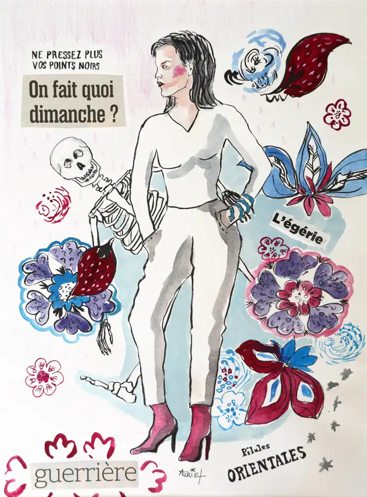 Crayon noir, crayons de couleur, gouache, encre, collage sur papier