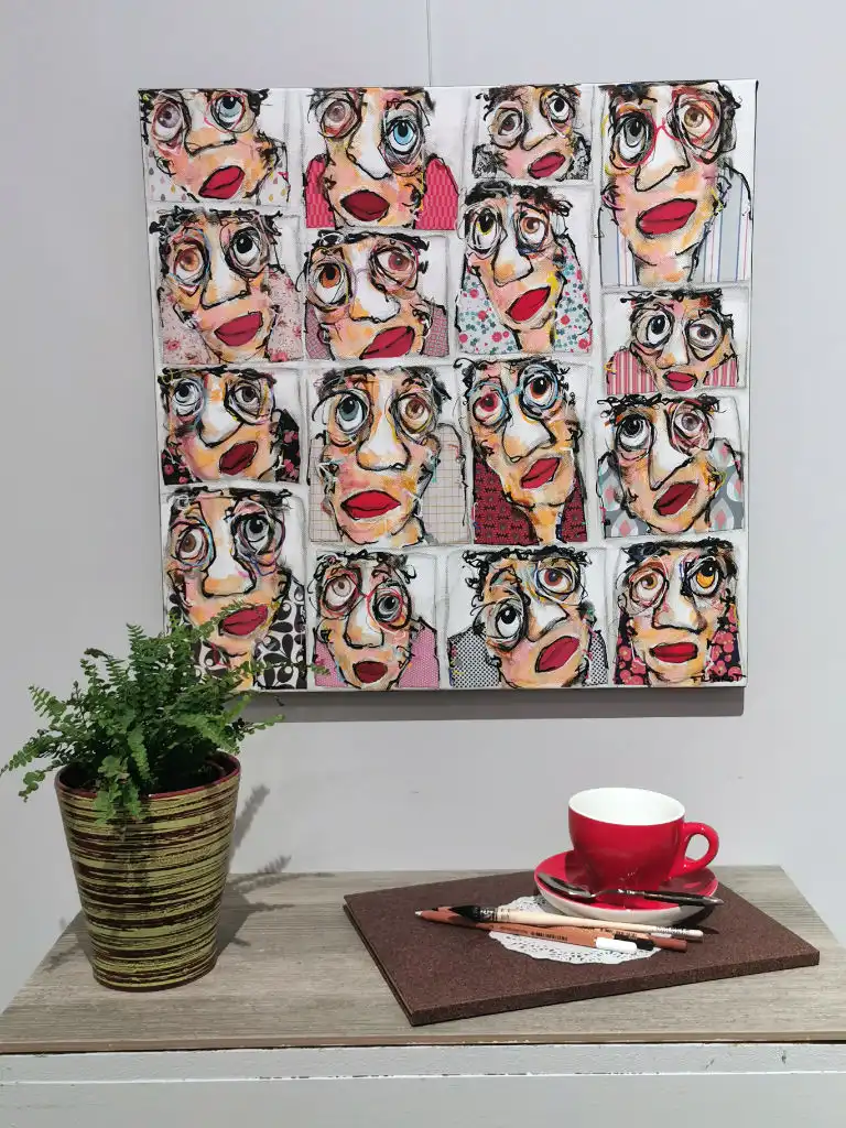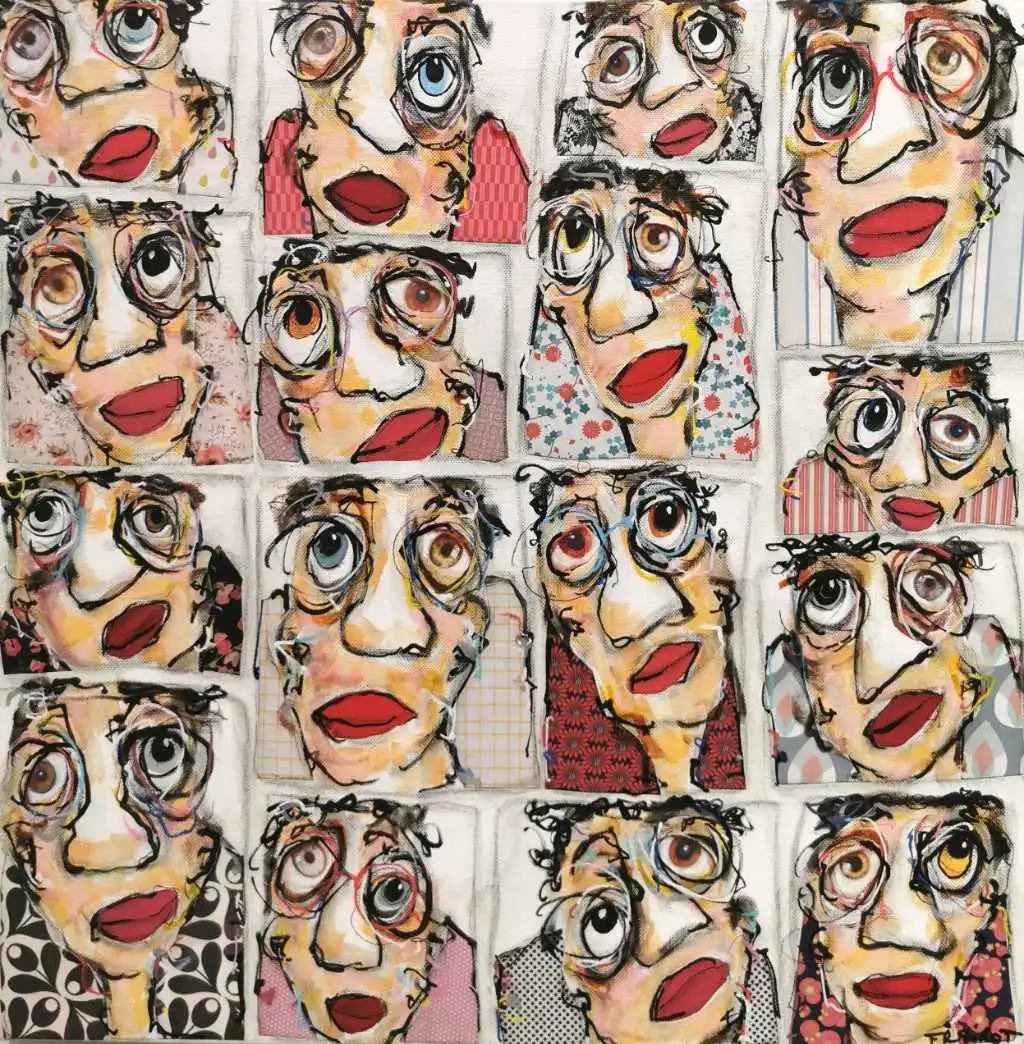 Cette oeuvre de l’artiste Maxime Frairot au format carré évoque une planche d’identité sortie d’un photomaton. Les bouches rehaussées d’un rouge à lèvres écarlate et les imprimés colorés des blouses de ces seize femmes ressortent sur le fond d’un doux ton gris clair. Pleine d’humeur et de tendresse, cette œuvre dynamisera votre intérieur.