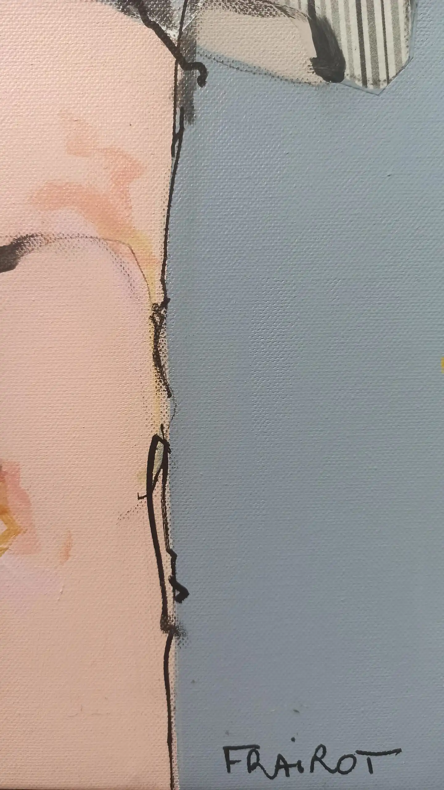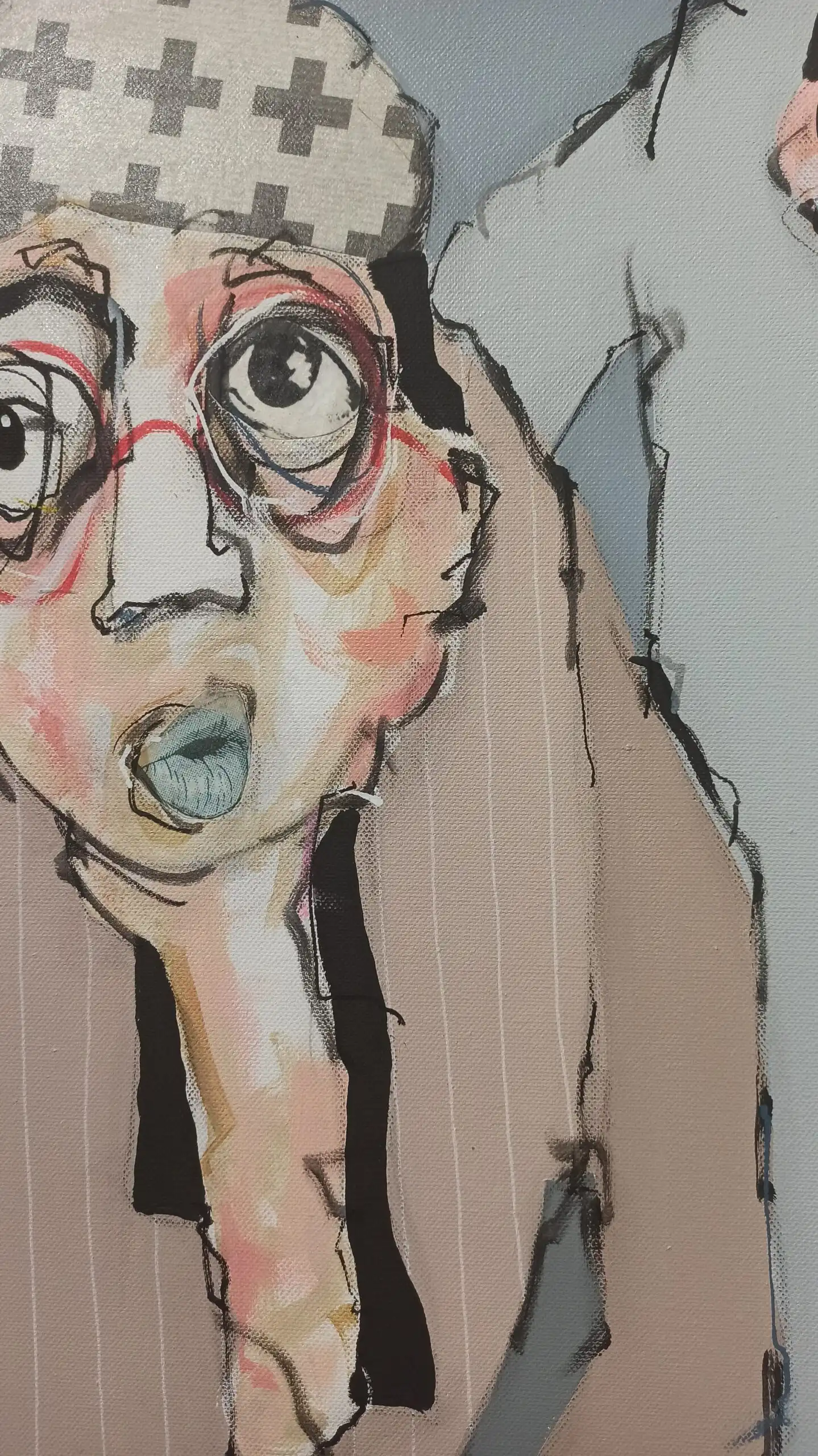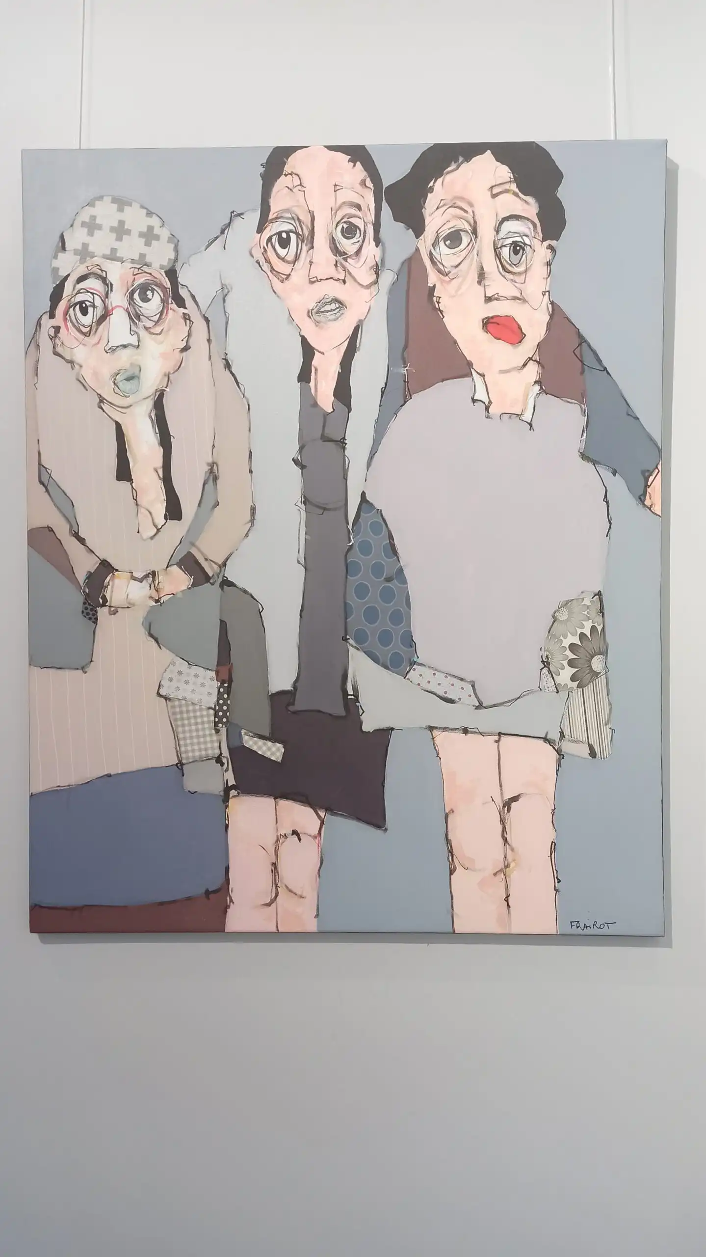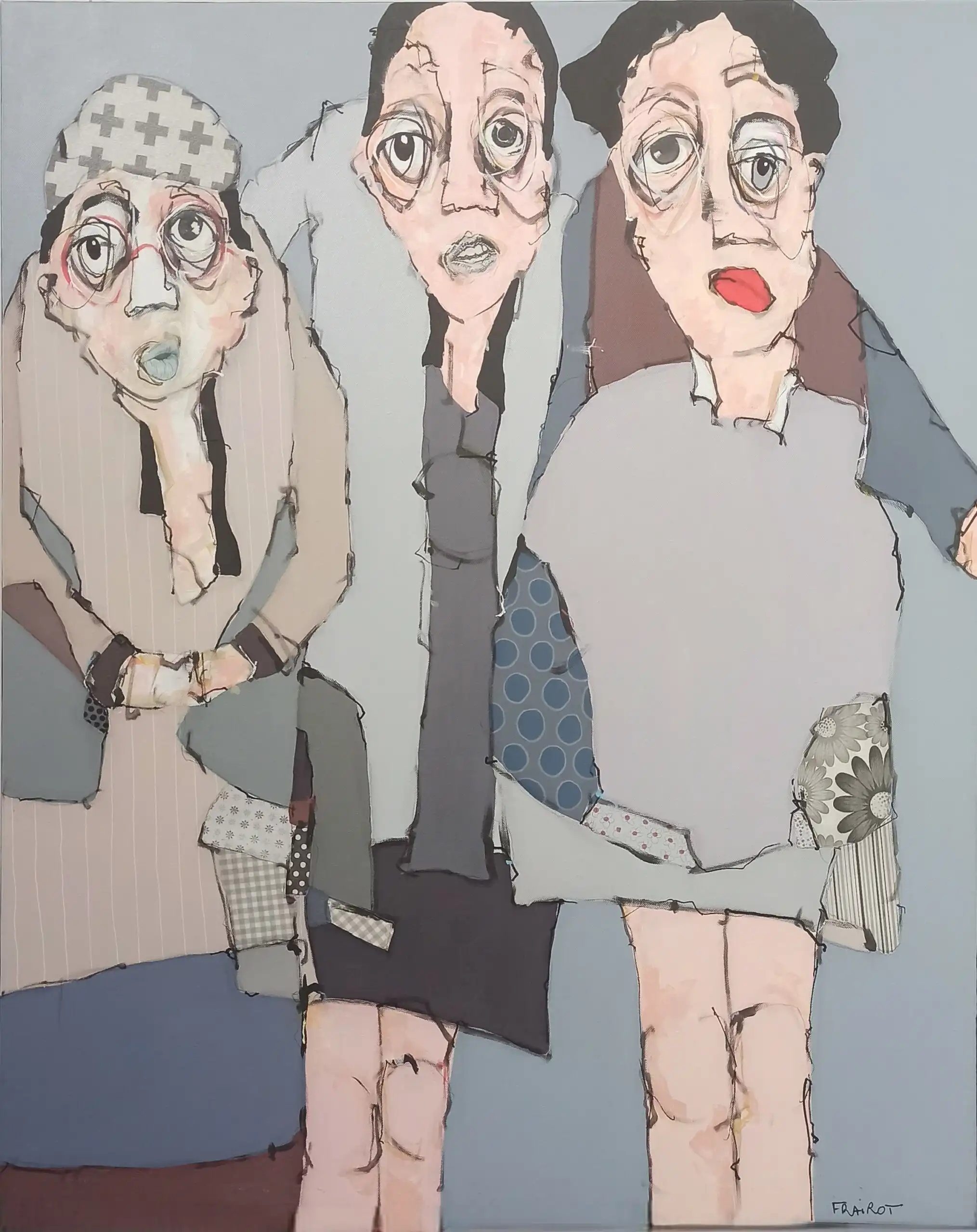 Cette œuvre présente trois figures humaines à l’expression saisissante, capturant immédiatement l’attention. Les formes délibérément déformées et angulaires confèrent aux personnages une allure unique et presque caricaturale. Les visages présentent de grands yeux expressifs, accentuant une esthétique d’étonnement ou de contemplation. Les couleurs sont douces mais variées, avec des nuances de bleu et de gris qui ajoutent une profondeur subtile à la toile. Chaque personnage est habillé de vêtements distincts, soulignant leur individualité tout en maintenant une harmonie visuelle. L’atmosphère générale est à la fois étrange et fascinante, invitant le spectateur à s’interroger sur l’interaction et l’émotion des personnages, créant ainsi une expérience visuelle mémorable et intrigante.