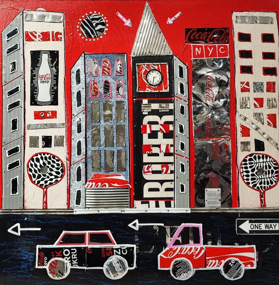 La ville de New York est une des sources d’inspiration favorite de l’artiste. Ses œuvres dynamiques et joyeuses, entre Pop art et art de la récup, mêlent acrylique, collage, recyclage de canettes de soda, boîtes de conserves, capsules de bouteilles clouées sur bois.