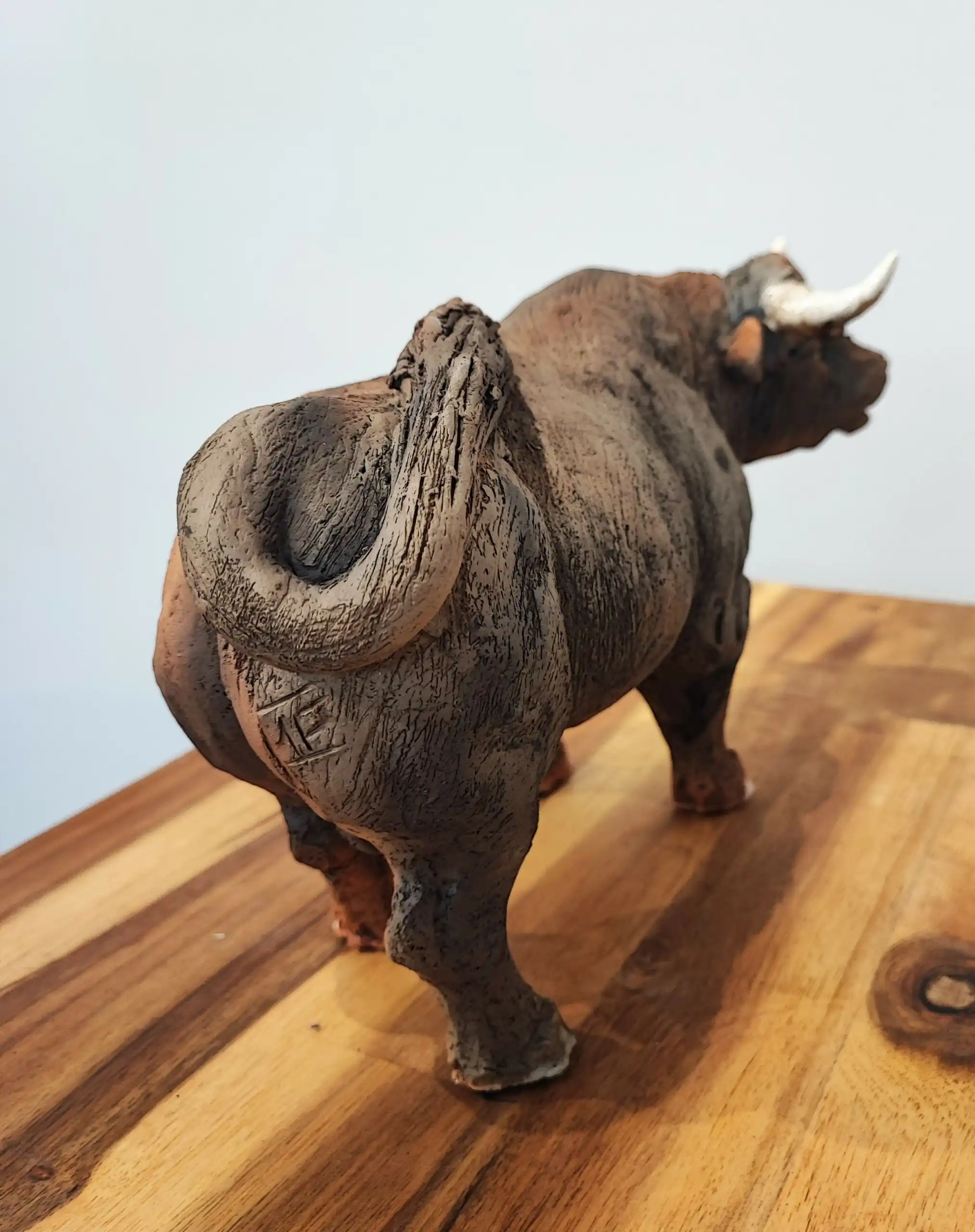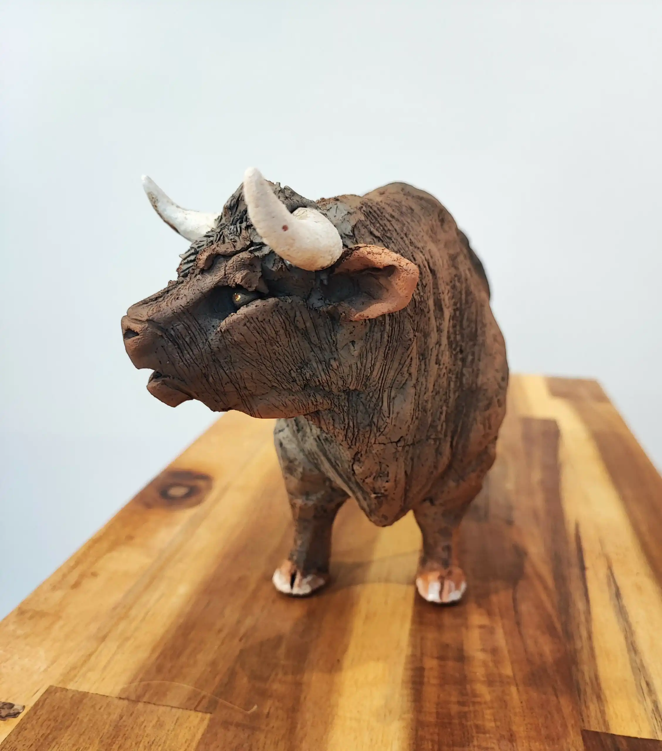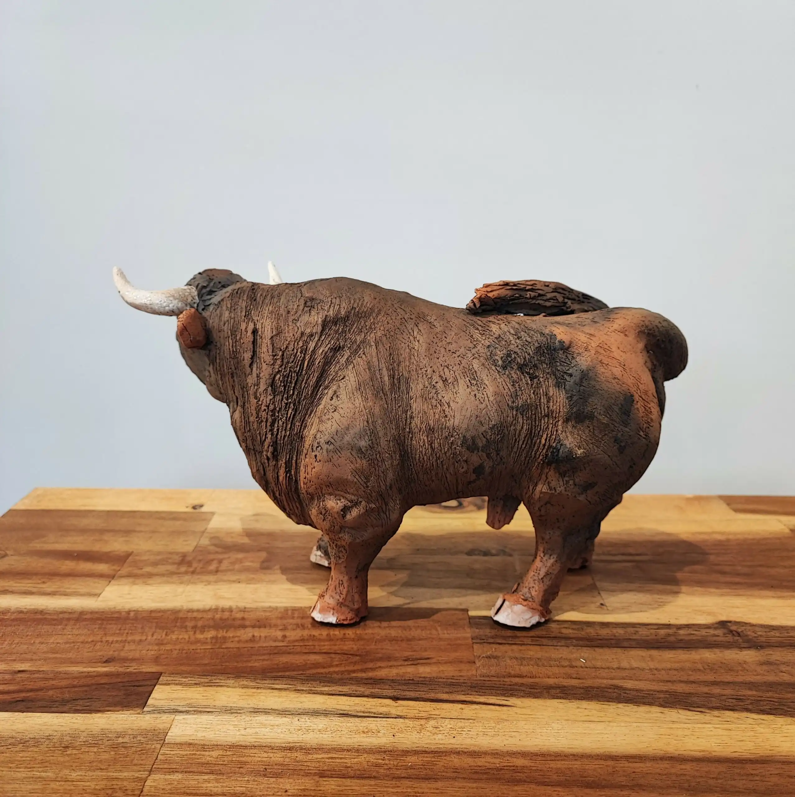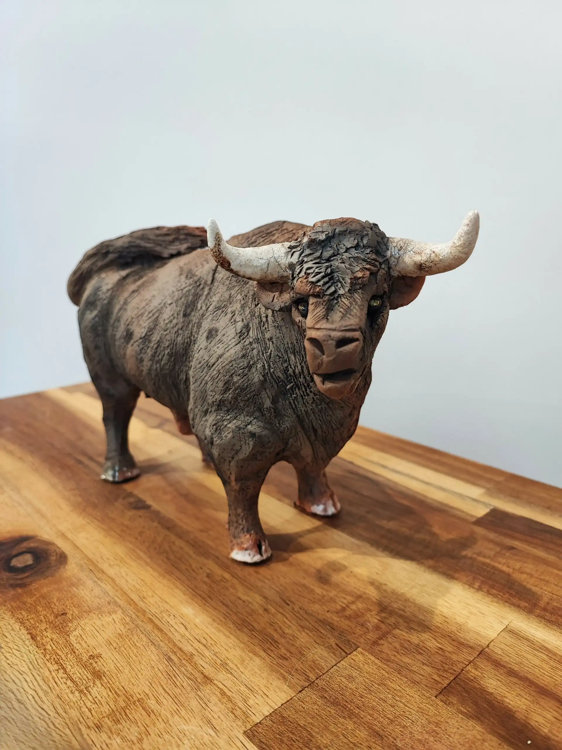 Cette sculpture captivante représente un taureau robuste au caractère imposant. Réalisée avec une minute remarquable, elle capture avec précision les détails anatomiques, depuis les muscles tendus jusqu’aux cornes élégamment courbées. La texture de la surface, évoquant le grain naturel de l’animal, contribue à sa qualité réaliste. Le choix judicieux des tonnes terreux accentue son aura de puissance brute et de noblesse. Posé sur une base en bois, le taureau dégage une impression de force inébranlable et de contenu, comme capturé au milieu d’un pas. La file d’attente légèrement relevée ajoute une dynamique subtile, renforçant l’impression que l’animal pourrait s’animer à tout moment. Cette œuvre, au-delà de sa beauté esthétique, interpelle par sa force symbolique et sa présence indéniable.