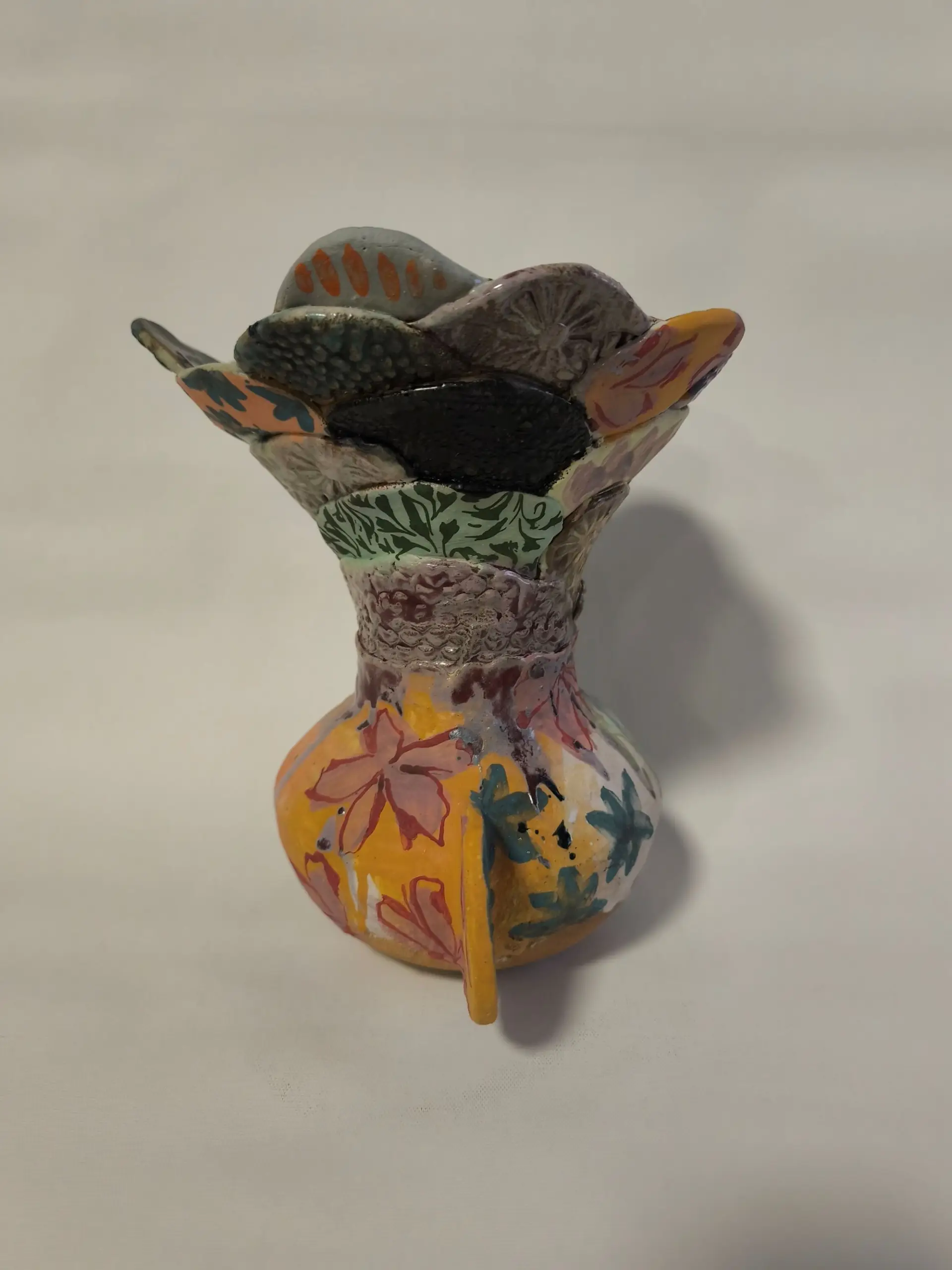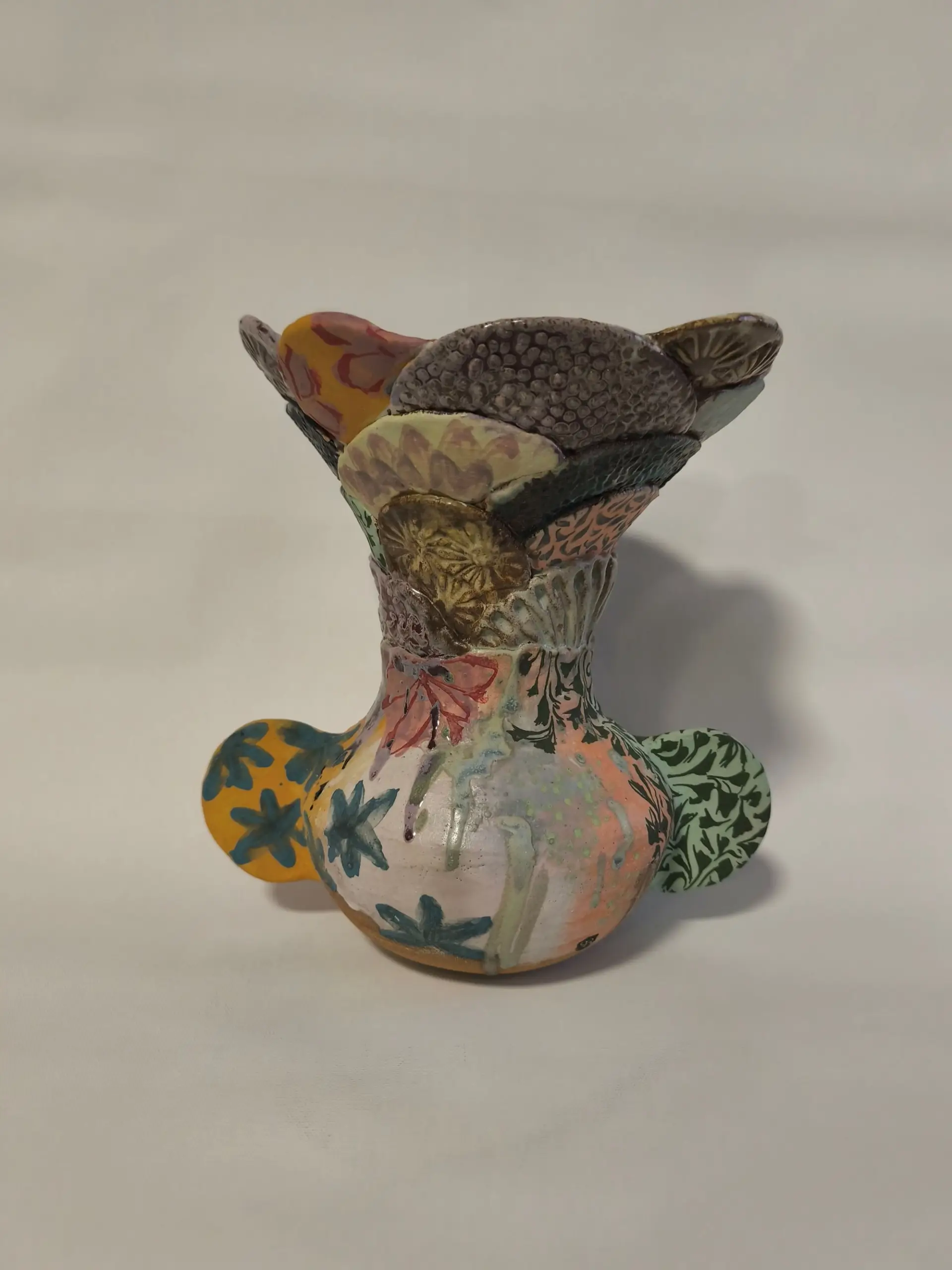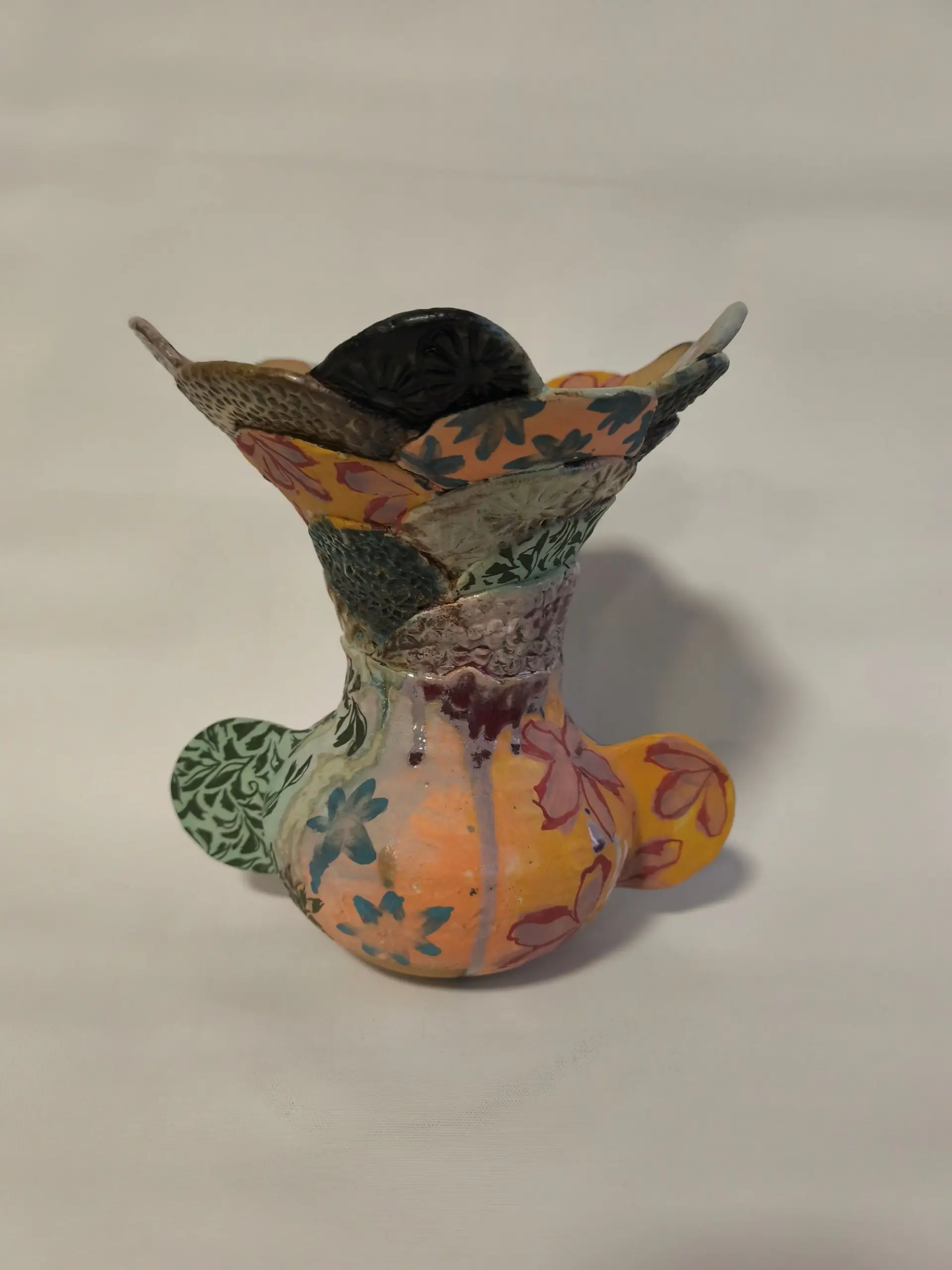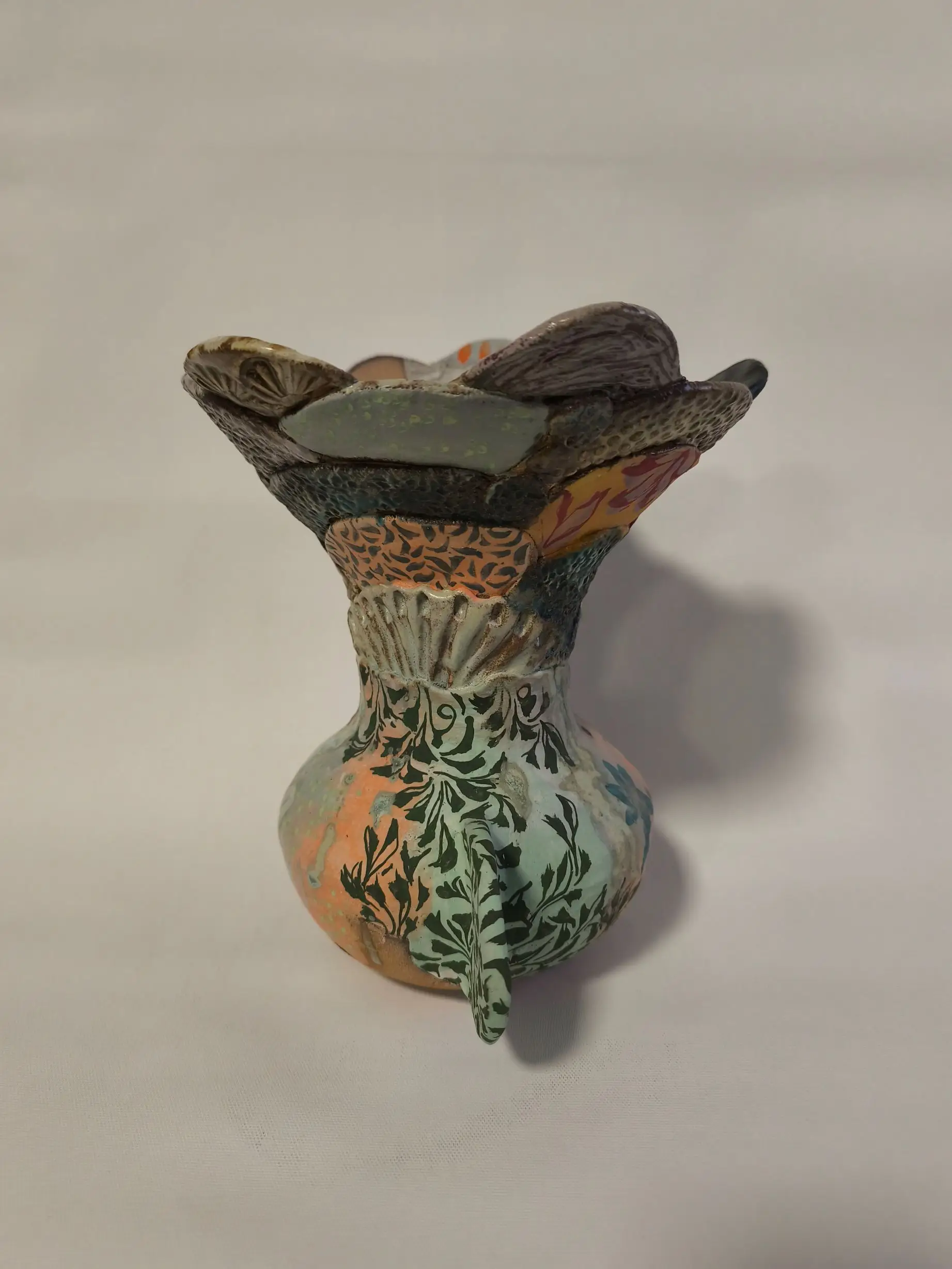 Dans ce vase sculpture, l’artiste mêle des motifs gravés dans la terre, des émaux, et des peintures figuratives sur une seule pièce, fusionnant au travail de la céramique son expérience de peintre.